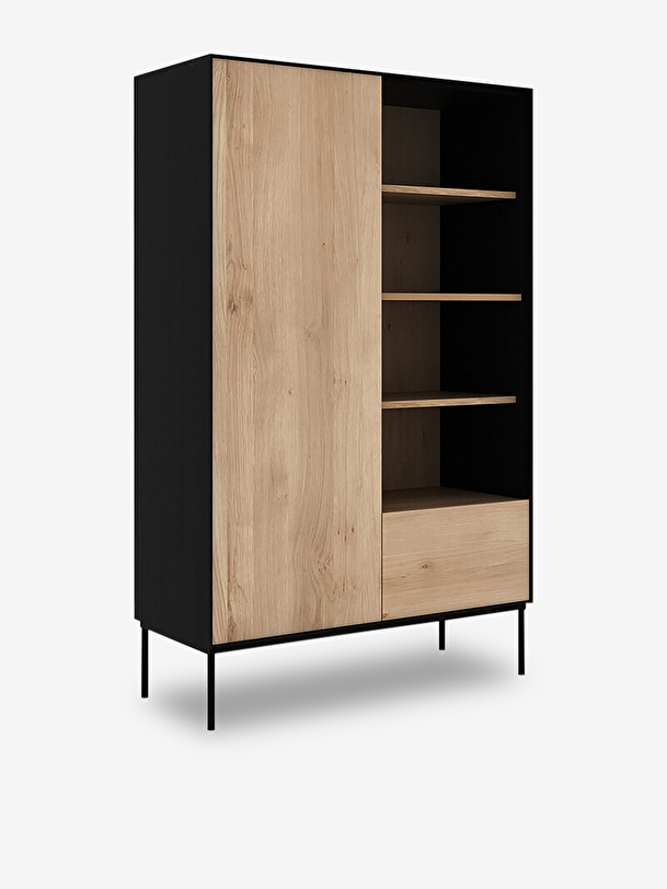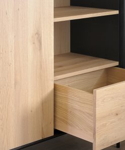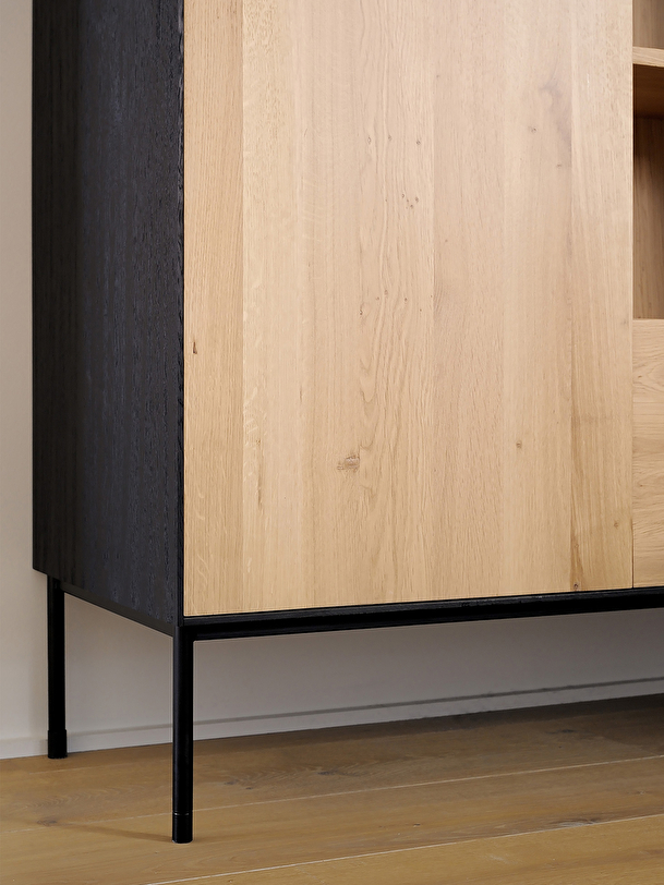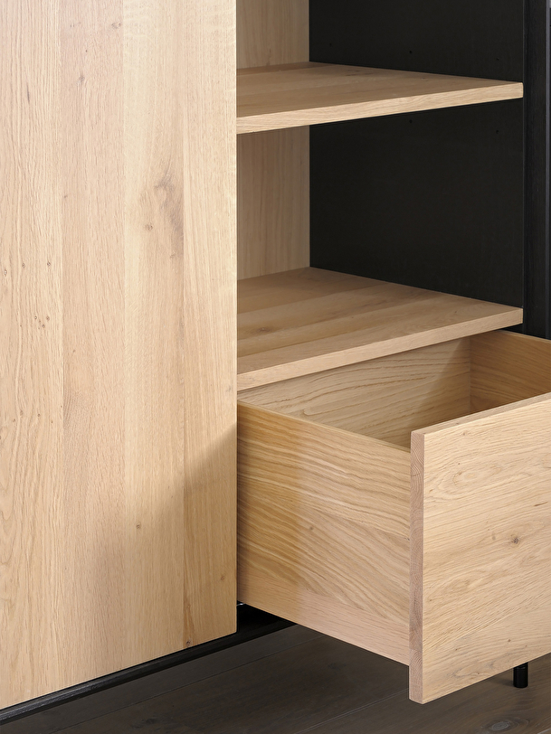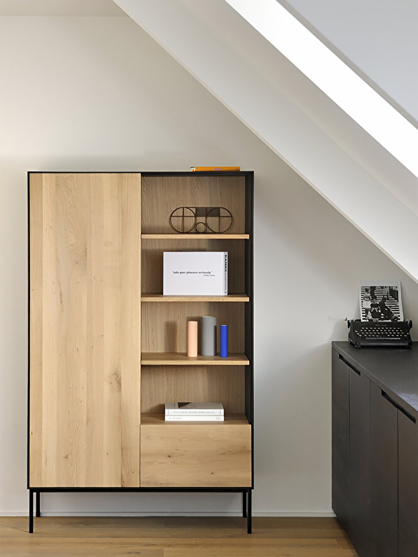 The designer Alain van Havre plays on contrasts with this graphic cabinet: different storage spaces in oak (a drawer, open shelves and others hidden by a door) on a light metal base. An ideal storage unit for the bedroom, dining room or DESK, to be combined with other elements of the Whitebird and Blackbird series for a contemporary styleFor authentic beauty, the wood selected from European forests may contain natural knots and cracks that make each piece of furniture unique. Available in several finishes.