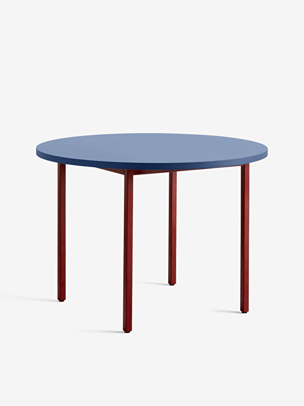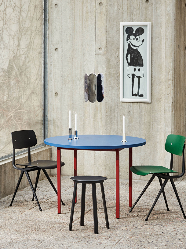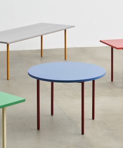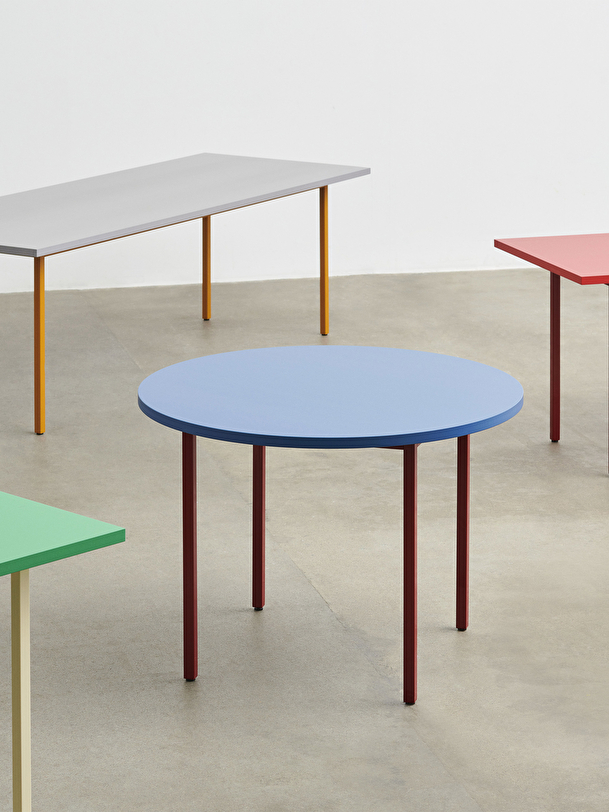 Described by its designers, the Belgian duo Muller Van Severen, as a clever marriage between two materials, the Two-Colour table series is inspired by contrasts. Featuring a tubular base for optimal strength and stability, the table surface is made of Valchromat, a unique sturdy MDF material that is FSC certified and finished with a water-based lacquer. The two elements create a uniform silhouette remarkable for the play of color contrast. Available in different shapes, sizes and color combinations, this table stands out for its uniqueness and ideal characteristics for a wide variety of environments, from cafés and restaurants to homes or office spaces. Go for color! Available in several sizes and color combinations.
