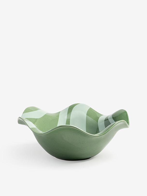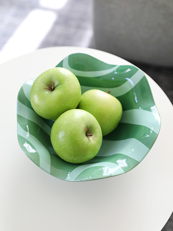 This retro-style bowl features undulating lines. It is adorned with two-tone tone-on-tone patterns. The two-tone print, combined with the flowing shapes, brings all your vintage desires to life. It can be used to present food or as a storage bin in an entryway.