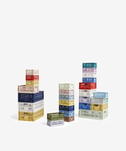 Made from 100% recycled post-consumer plastic waste and available in a variety of colors and sizes, the crates can be stacked on top of each other in different size combinations.