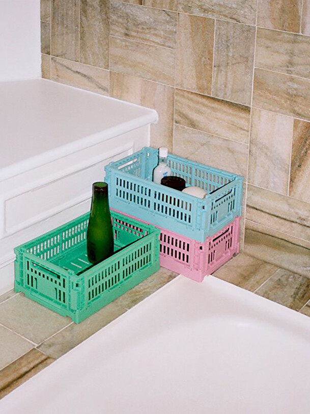 Made from 100% recycled post-consumer plastic waste and available in a variety of colors and sizes, the crates can be stacked on top of each other in different size combinations.