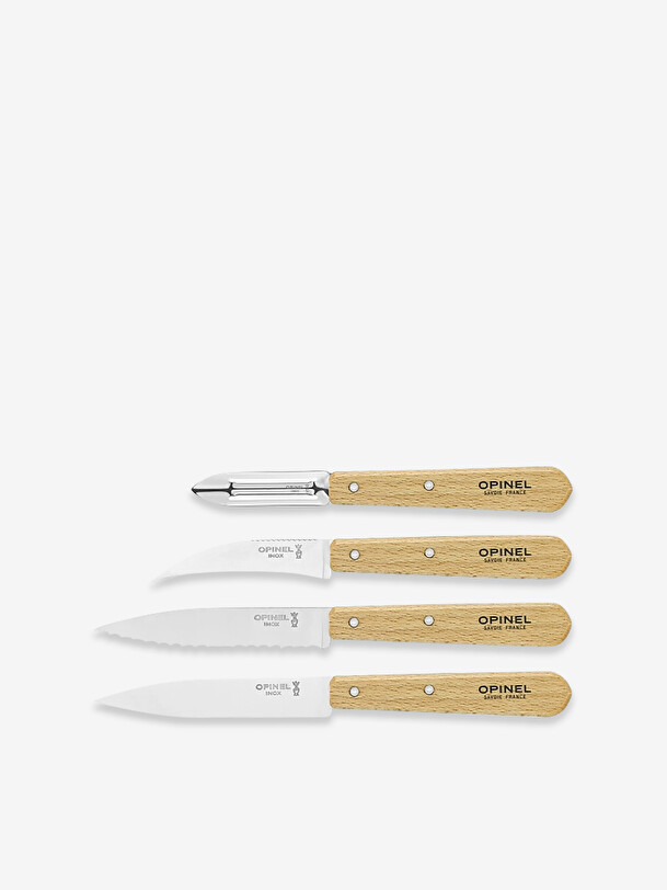 The box set is made up of 4 small knives that are easy to handle and effective for everyday use: the Paring knife, the Serrated knife, the Vegetable knife, the Peeler.