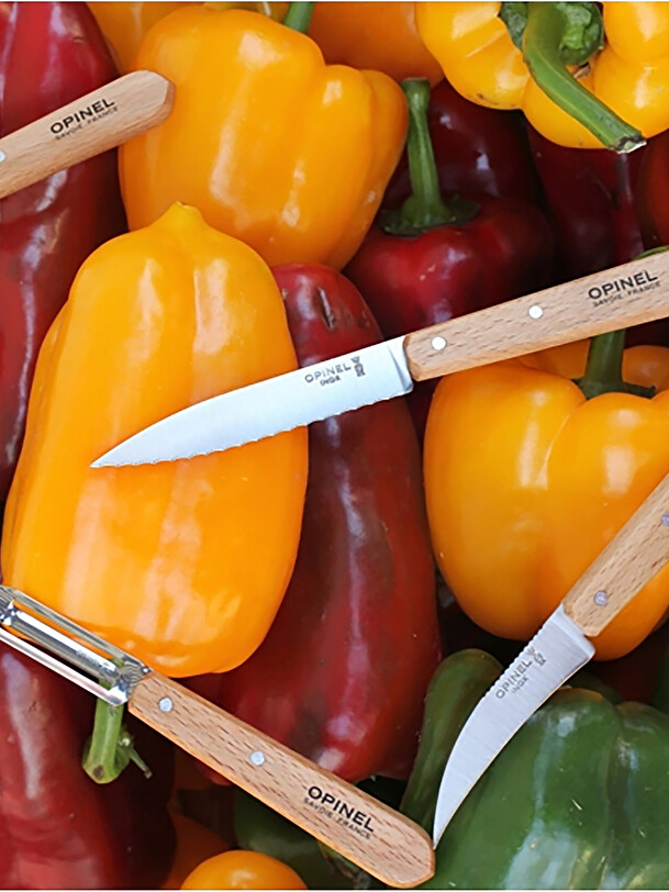 Paring knife, serrated knife and peeler made in France. Vegetable knife made in Portugal.