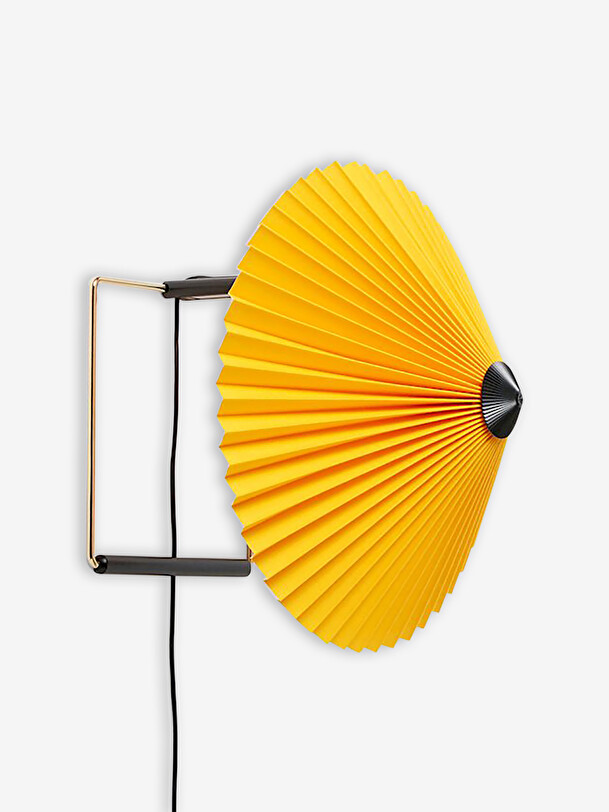 Designed by Inga Sempé, the Matin wall lamp offers a contemporary and poetic design, with a construction that combines visual delicacy and physical robustness. The lamp head can be tilted approximately 45 degrees up and down to create ambient lighting upwards as well as directional lighting downwards. The wall lamp consists of a bent steel wire frame, finished in polished brass with matte black hardware, and is paired with a pleated cotton shade, available in two sizes and a variety of vibrant colours. The light source is an integrated LED, providing a diffused light that is accompanied by an in-line digital dimmer to adjust the light output as required. Dimensions: