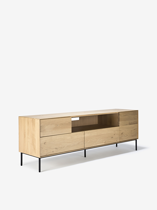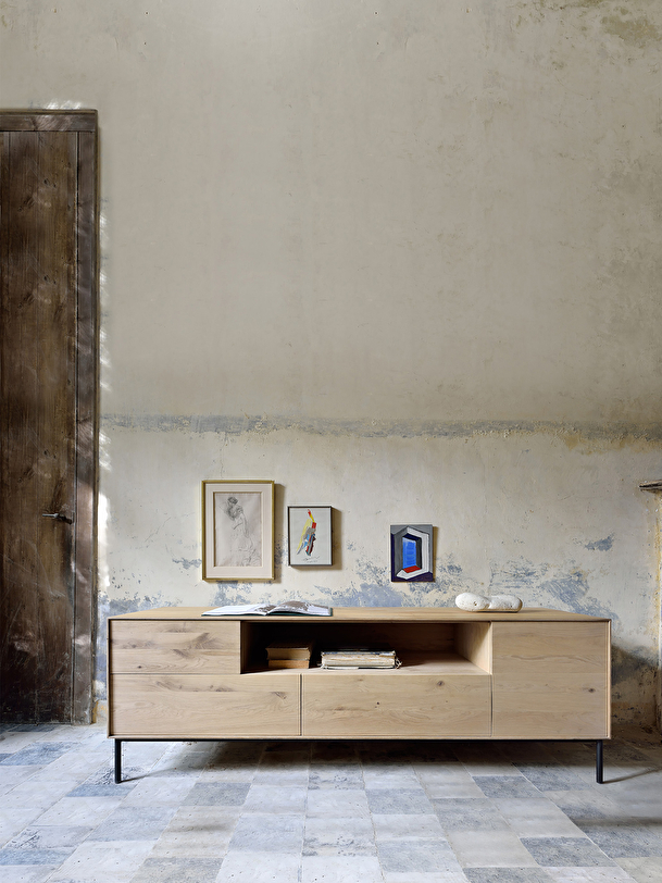 Within the Whitebird and Blackbird collections, designer Alain van Havre also offers a very functional TV cabinet. Very graphic, this piece of furniture with clean lines plays on the contrasts between a solid oak body and a tubular metal base. Equipped with plenty of storage, it will allow you, thanks to its central shelf, to easily install your peripheral utilities thanks to the cable management or your large art books. In a concern for authentic beauty, the wood selected from European forests may contain knots and natural cracks which make each piece of furniture a unique piece. Available in several finishes.