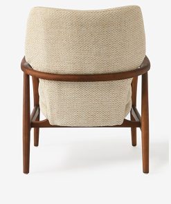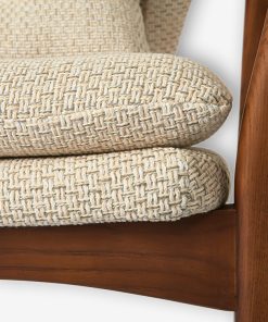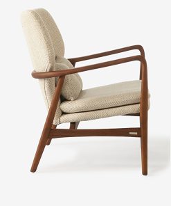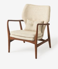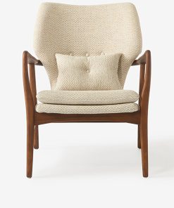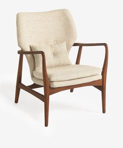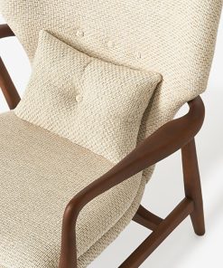The silhouette of the Peggy armchair, an ode to the Scandinavian style of the 1950s, is composed of a polished ash structure (100% FSC) with a rounded and refined look and a wrap-around seat dressed in mottled fabric, adorned with 3 buttons on the back.The woodwork is handcrafted, while maintaining impeccable finishes. A timeless style that will slip into your interior, from the bedroom to the living room, emphasizing a sober and elegant intention. A small cushion covered with the same fabric as the seat is provided.