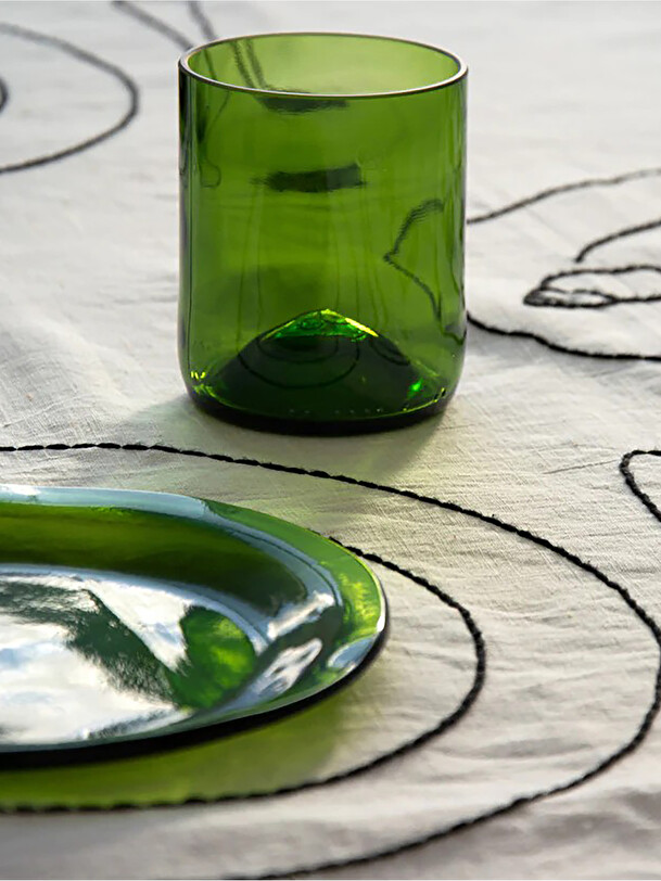 Short drink glasses made from green Bordeaux bottles.