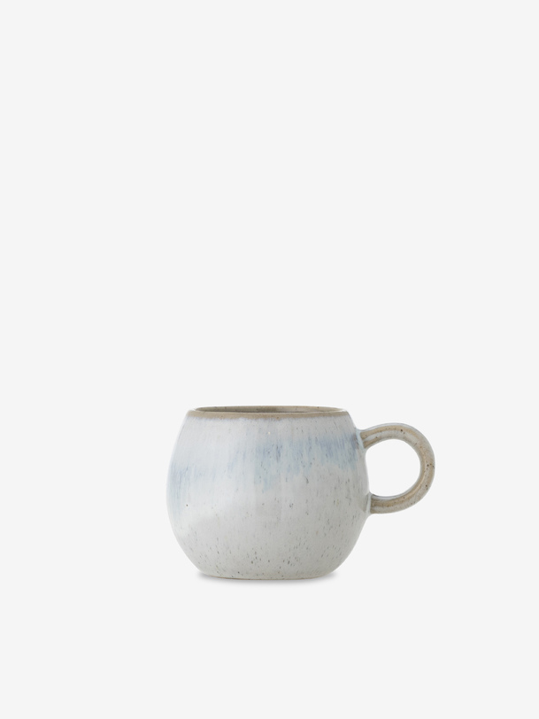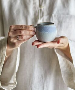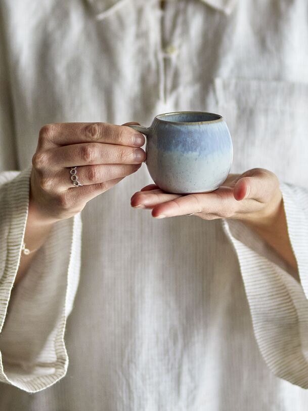 Une forme ronde, un émail doux aux reflets bleutés, un fini légèrement rustique. Chaque tasse est unique, avec des variations subtiles dans la matière. Compacte et pleine de charme, elle accompagne vos espressos avec simplicité. L’élégance du quotidien, sans superflu. Dimensions : D7xH6 cm.