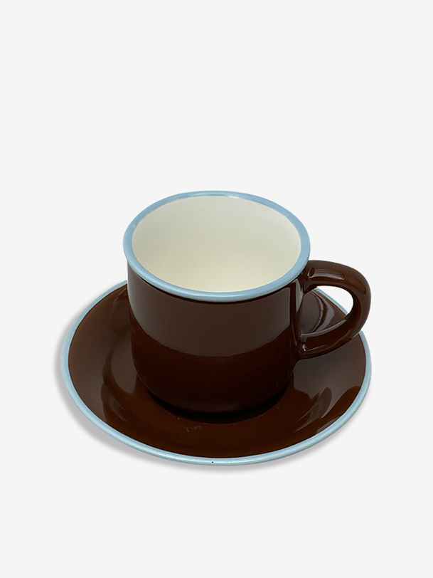 Une teinte chocolat profond, soulignée par un liseré bleu ciel : cette tasse en grès émaillé joue sur les contrastes avec justesse. Son intérieur crème met en valeur la boisson, sa forme droite reste ancrée dans le fonctionnel. Avec sa soucoupe assortie, elle devient une alliée du quotidien, entre rigueur et douceur. Une pièce brute, belle, et faite pour durer. Dimensions : 5,5 x 5,5 cm.