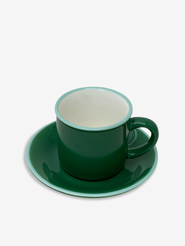 Simple, dense, assumée. Cette tasse en grès émaillé vert profond joue la carte du contraste avec son intérieur blanc crème. Une ligne droite, une anse confortable, une soucoupe assortie : tout est là, sans superflu. Parfaite pour un café serré ou un espresso du matin. Une pièce du quotidien qui traverse les modes, avec caractère et sobriété. Dimensions : 5,5 x 5,5 cm.