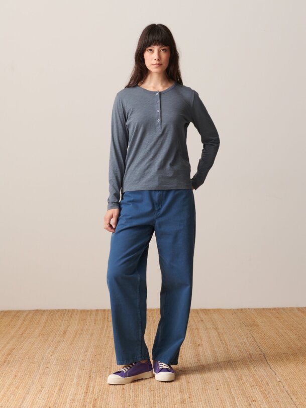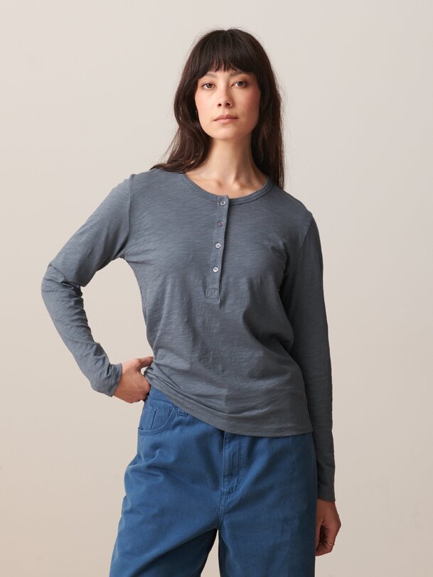 Alexandra T-shirt in permanent jersey with polo placket. Straight cut and round neckline. The button placket is on the front. Its sleeves are long.