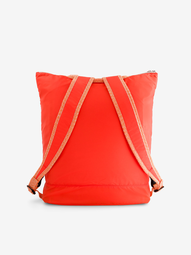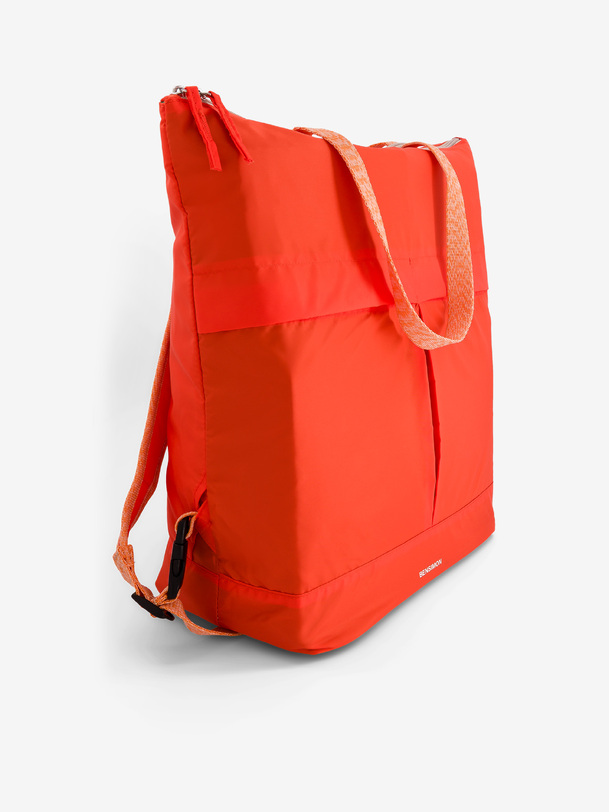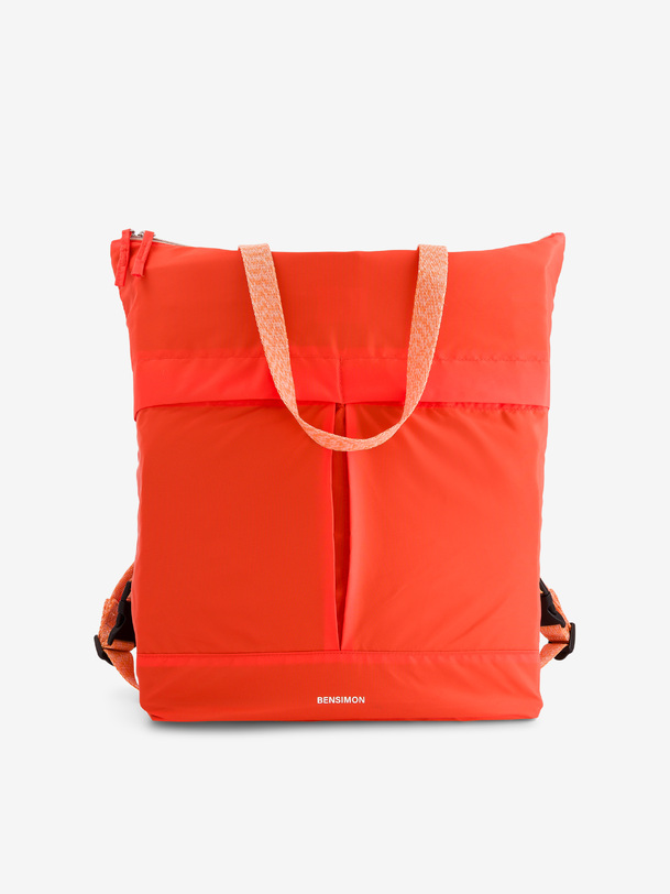 Backpack with a large zippered pocket and two front snap pockets. A handle for carrying by hand or over the shoulder, and retractable back straps. One interior zippered pocket and a foam-reinforced laptop pocket. Dimensions: 44 x 20.5 x 44 cm. Zipper closure.