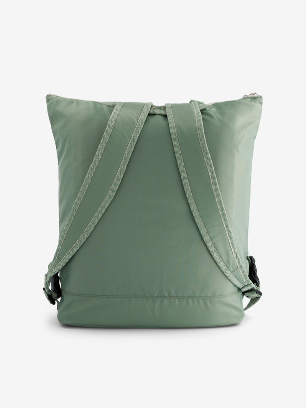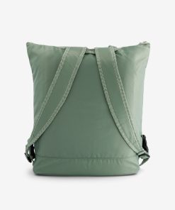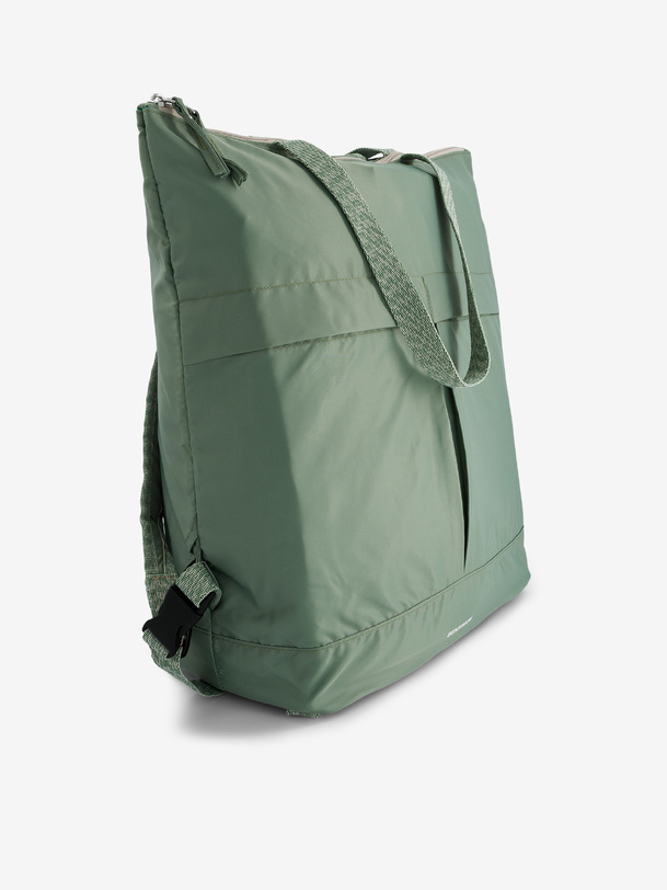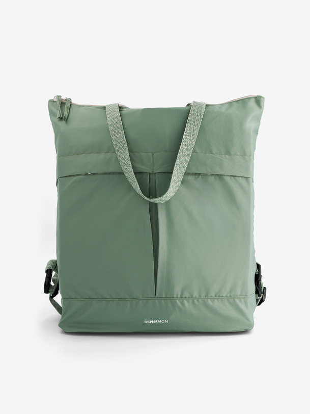 Backpack with a large zippered pocket and two front snap pockets. Handle for carrying by hand or over the shoulder, and retractable straps for the back. One interior zippered pocket and one foam-reinforced laptop pocket. Dimensions: 44 x 20.5 x 44 cm. Zipper closure.