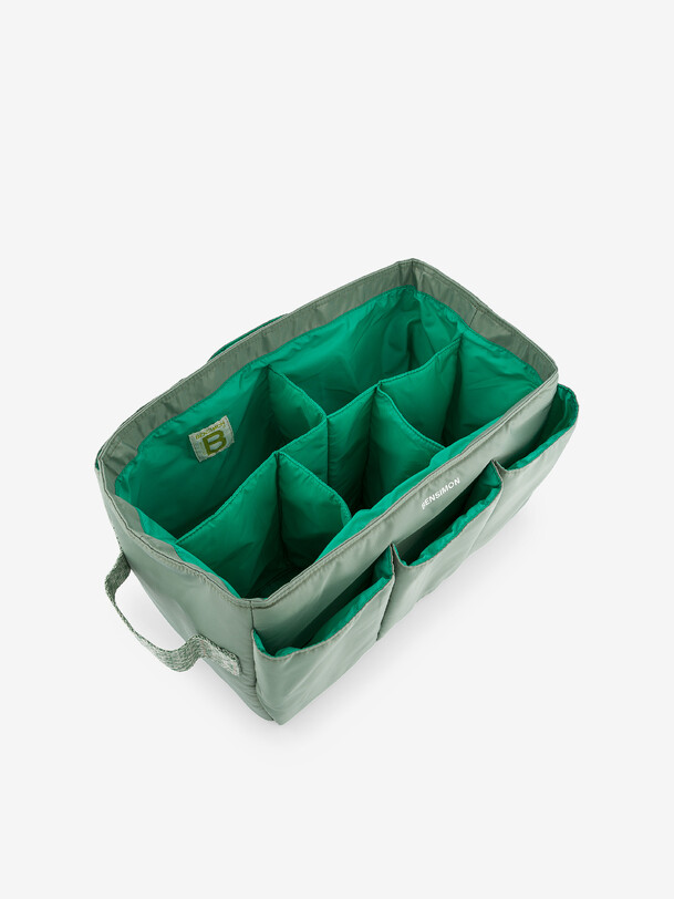 Foldable storage rectangle with 5 compartments. Dimensions: 35 cm long, 19 cm wide, and 23 cm high.