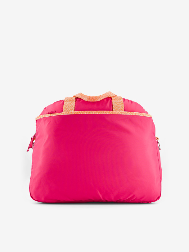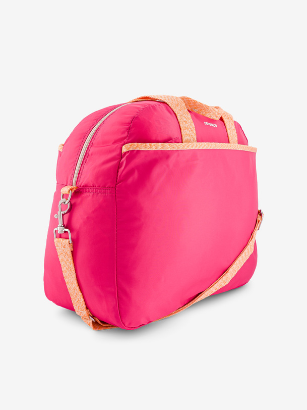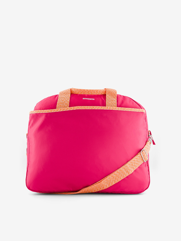Large tour bag with a large zippered pocket and a front pocket. It has double handles and an adjustable strap. It has four pockets, three of which are zippered, and one interior zippered pocket. Its dimensions are 45 cm long, 21 cm wide, and 38 cm high. It has a zippered closure.