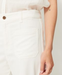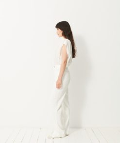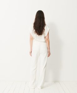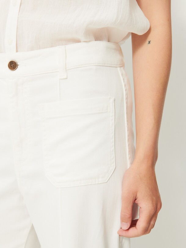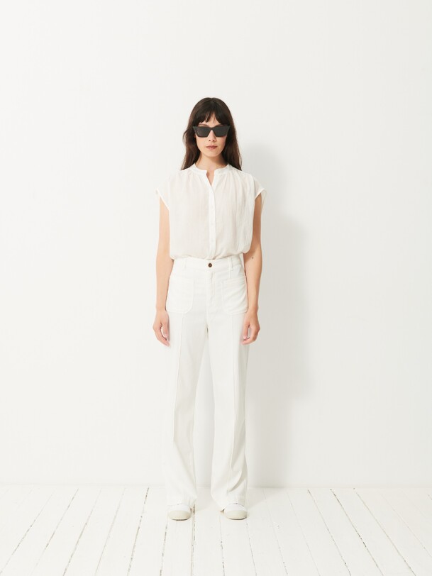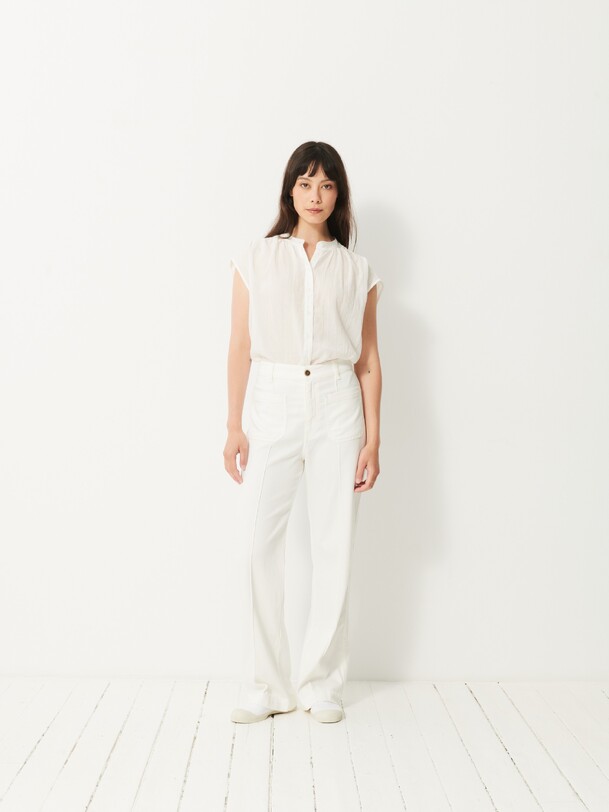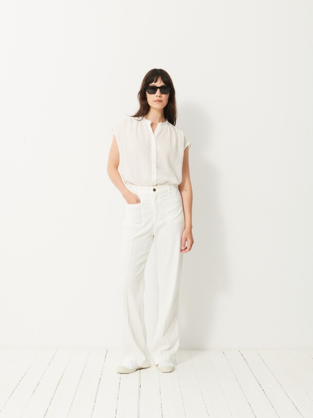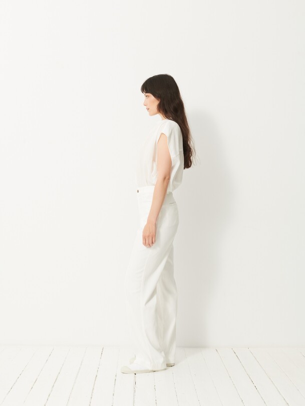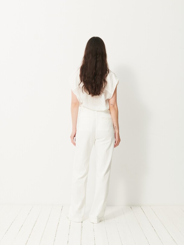 The Bluli trousers are high-waisted tencel twill trousers featuring patch pockets at the front and welt pockets at the back. They boast a wide leg with stitched-down pleats at the front and back centres. Inspired by sailor trousers, they have a length of 108.7 cm.