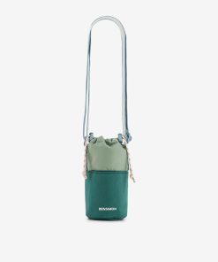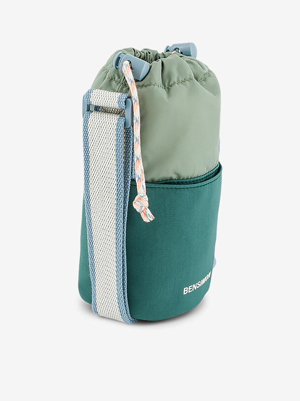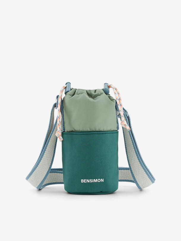 Bottle bag. Capacity for a 75 cl bottle. It features one front pocket and an adjustable strap. Zipper closure. Dimensions: length 8 cm, width 8 cm, height 20 cm.