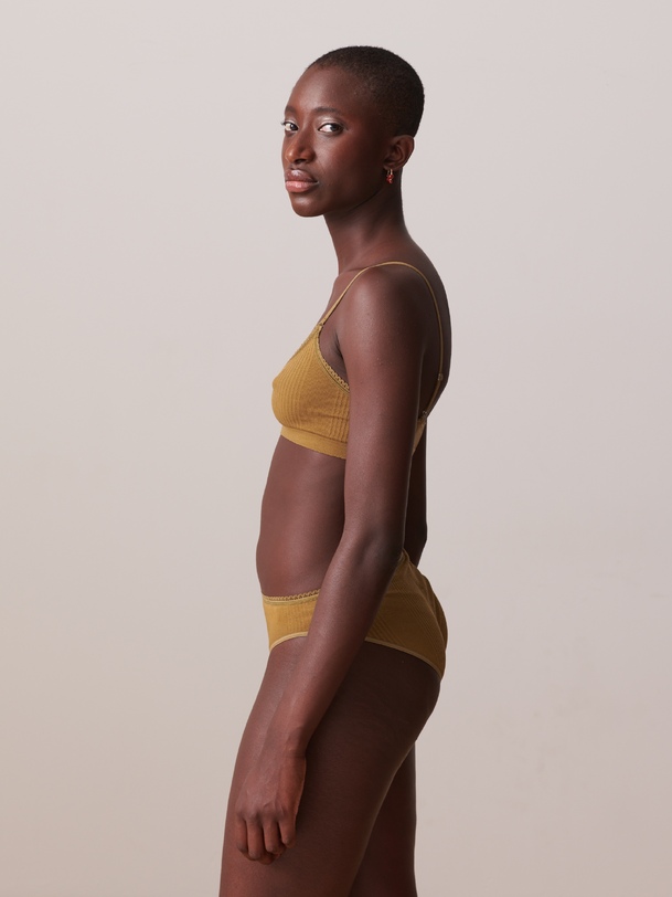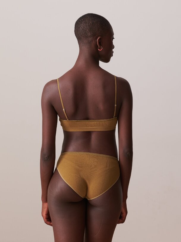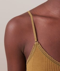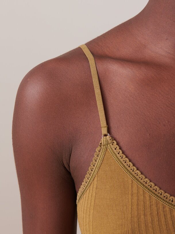 Ribbed bralette with rounded V-neck and scalloped edge. Thin adjustable straps. Diagonal ribbing.