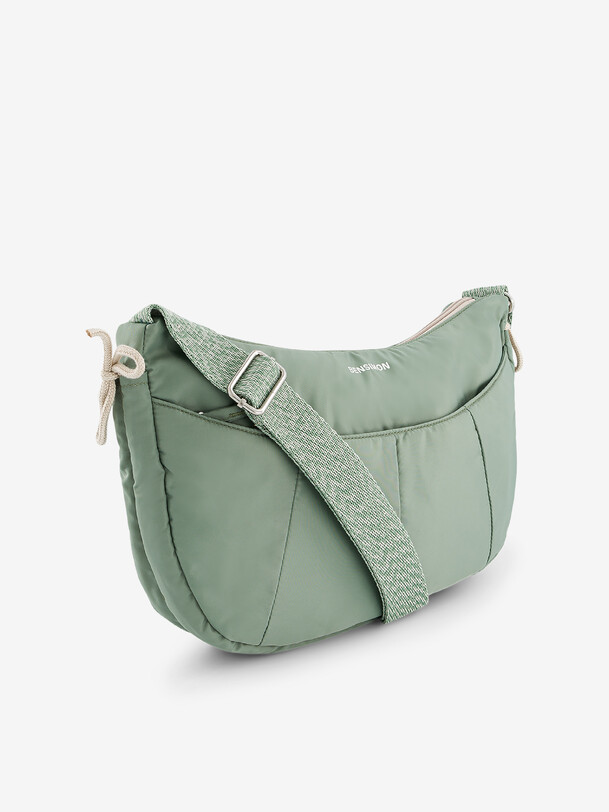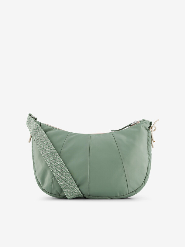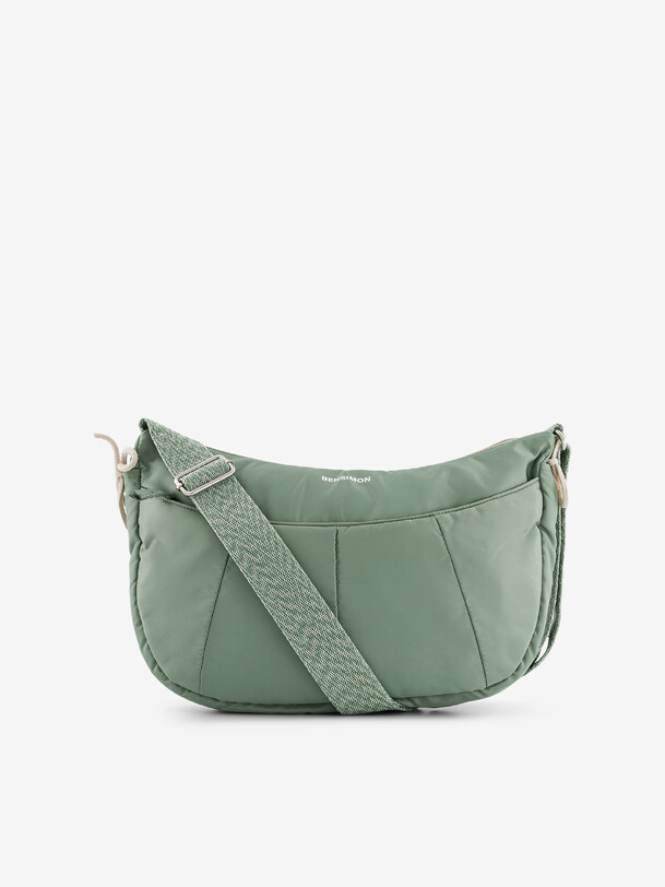 Medium-sized Half Moon bag. Large front zipped pocket and one interior zipped pocket. Drawstrings to tighten the sides. Dimensions: length 34 cm, width 5 cm, height 22 cm. Zipper closure.