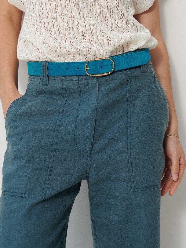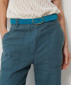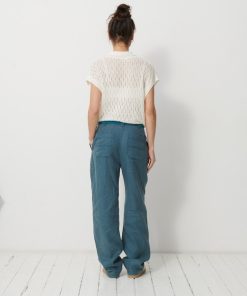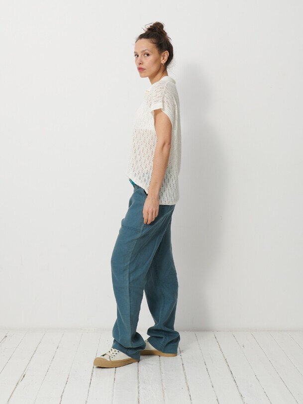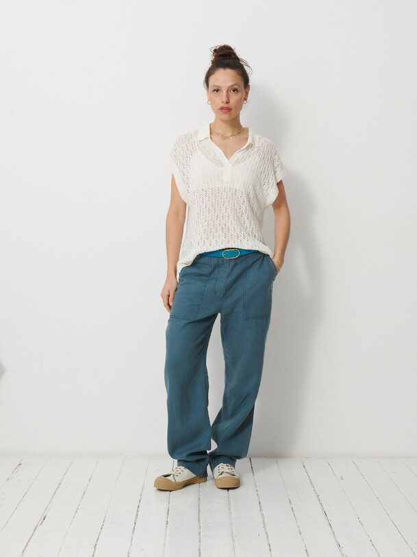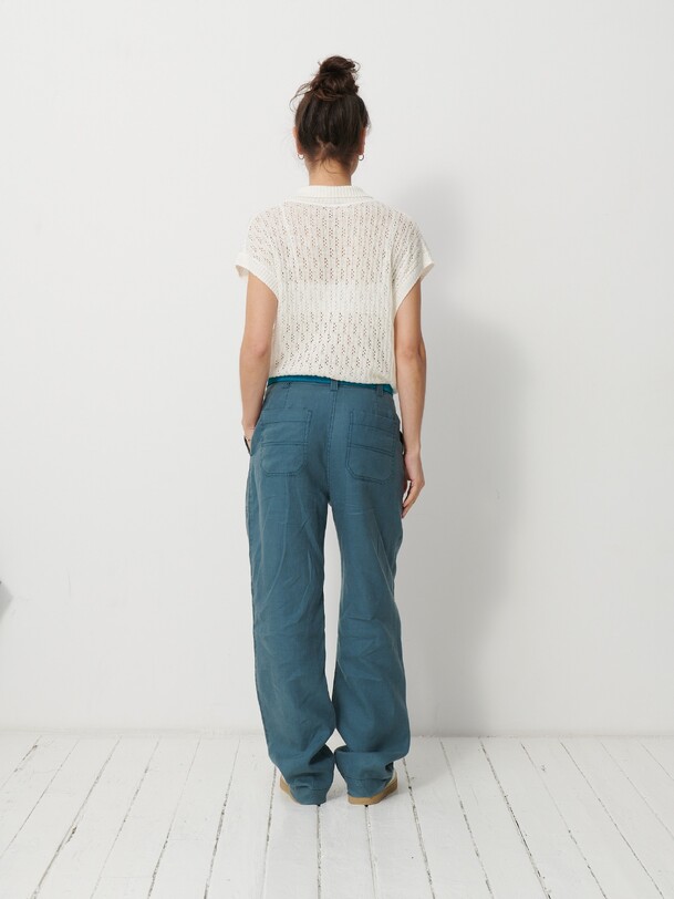 The Hugues trousers feature a straight-leg design with front patch pockets. The waistband is flat with belt loops. They have back patch pockets and a folded hem. Inspired by multi-pocket military trousers.