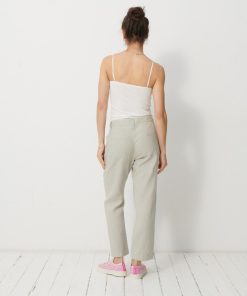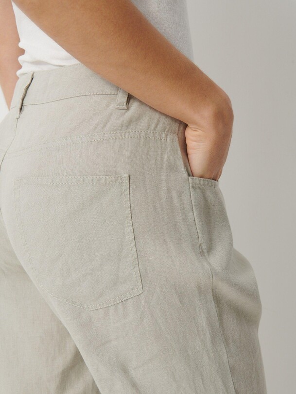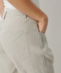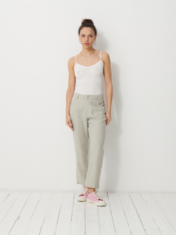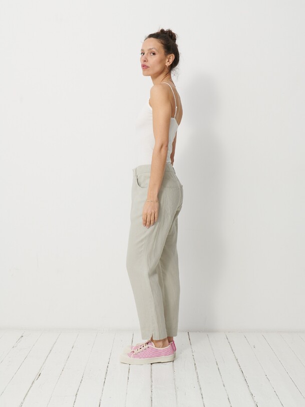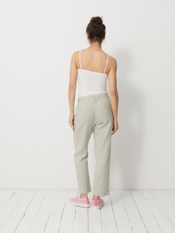 The Ipanema trousers are a pair of linen cigarette trousers featuring Italian front pockets and patch pockets at the back. They fasten with a zip fly and are equipped with a belted waist that includes belt loops.
