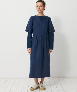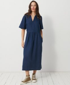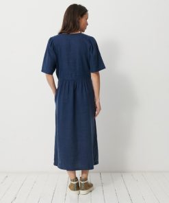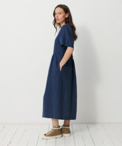Jada Long Linen Dress. It features a V-neck and wide, half-length sleeves. Gathered at the waist for a flattering fit. Vertical seams at the armholes. Stitched hem on the sleeves and at the bottom of the dress.
