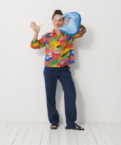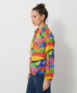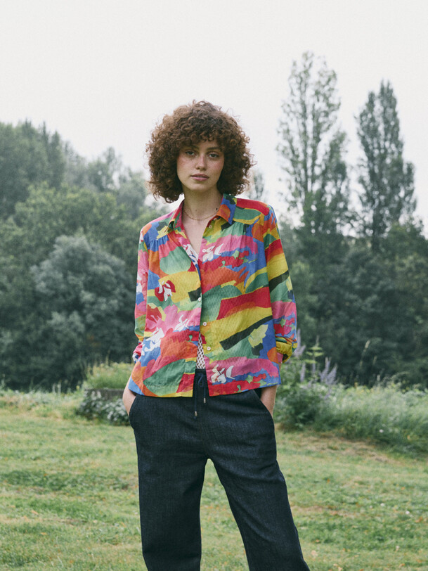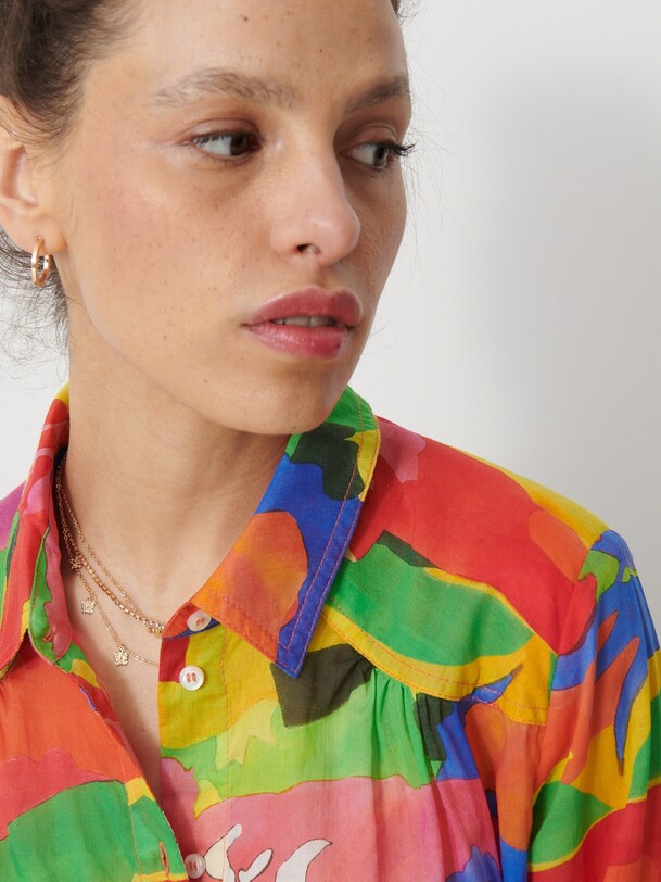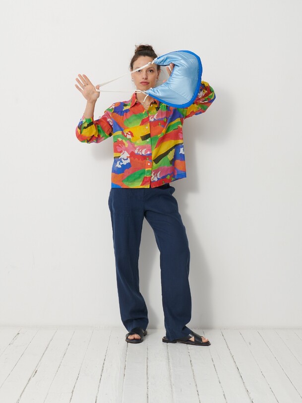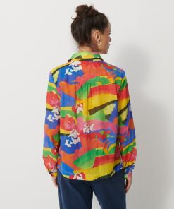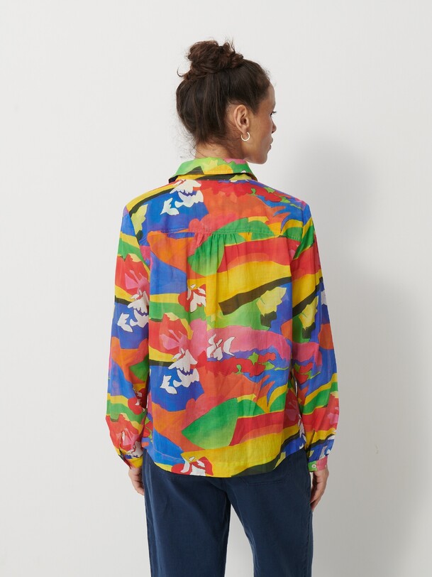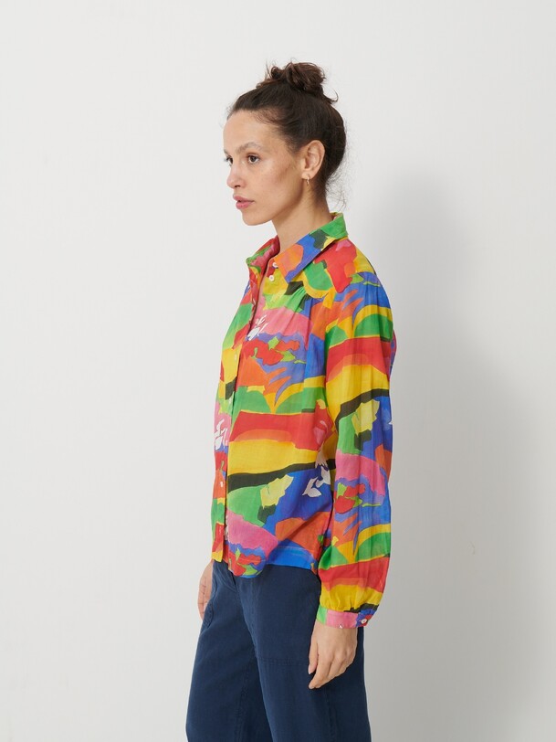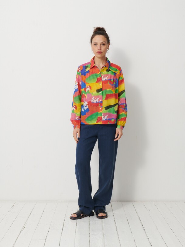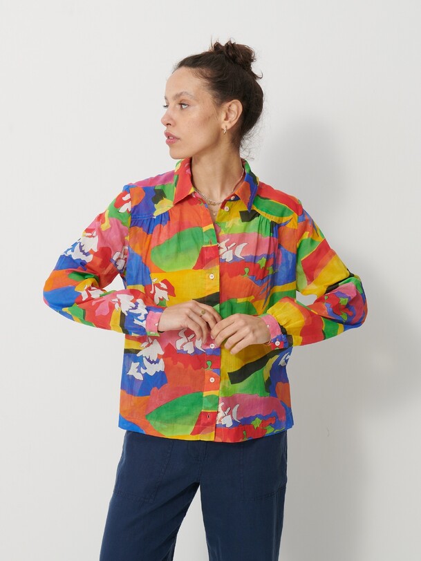 Jeanie Printed Blouse featuring a gathered, rounded yoke at the front shoulders. It has a classic collar and long sleeves with slim, gathered cuffs. The back yoke is distinguished by gathers at the centre back.