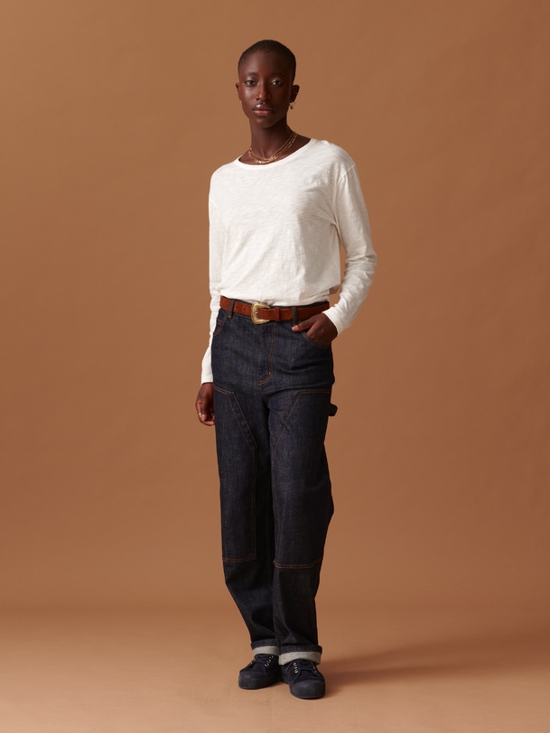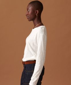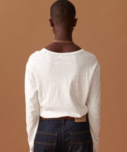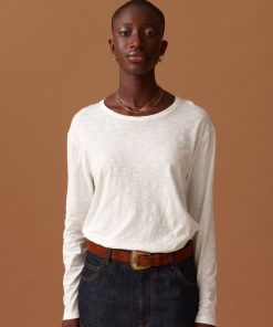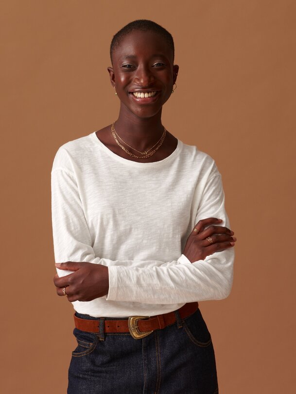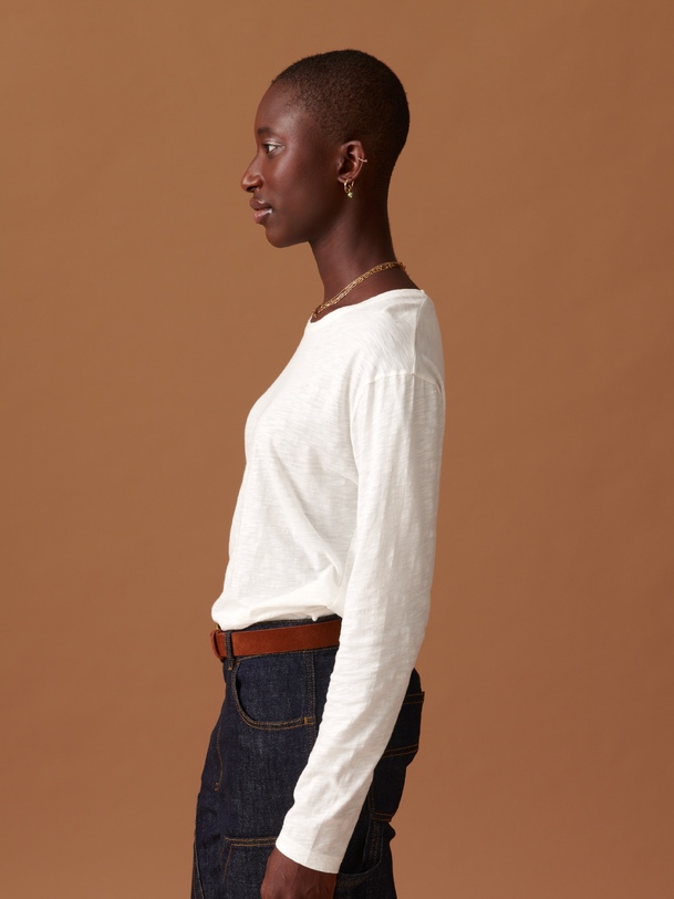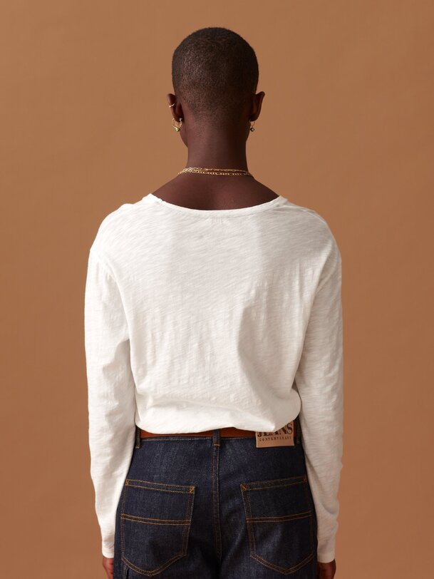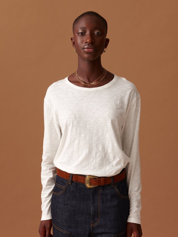 The July T-shirt is made of slub cotton with long sleeves. It has a boxy fit and a round neckline with topstitched detailing. The hem is topstitched at the bottom and cuffs. The neckline is finished in a contrasting color.