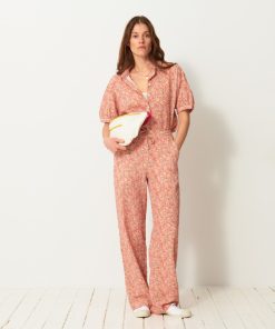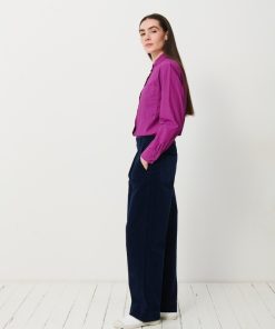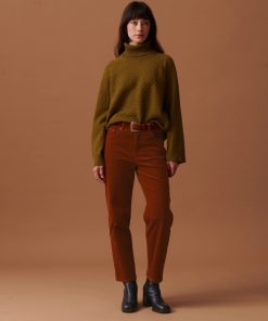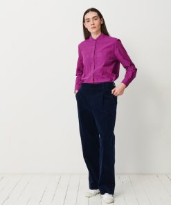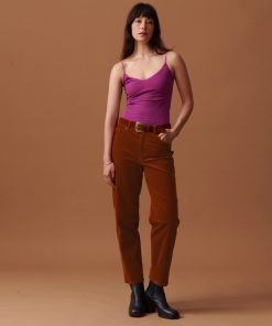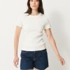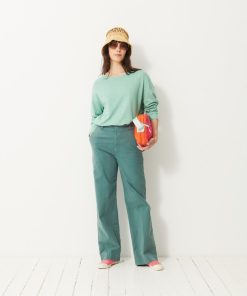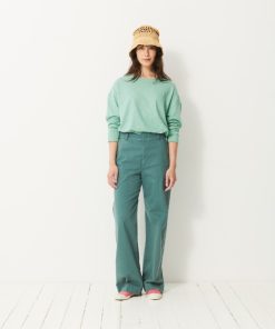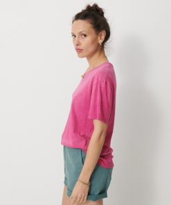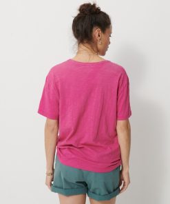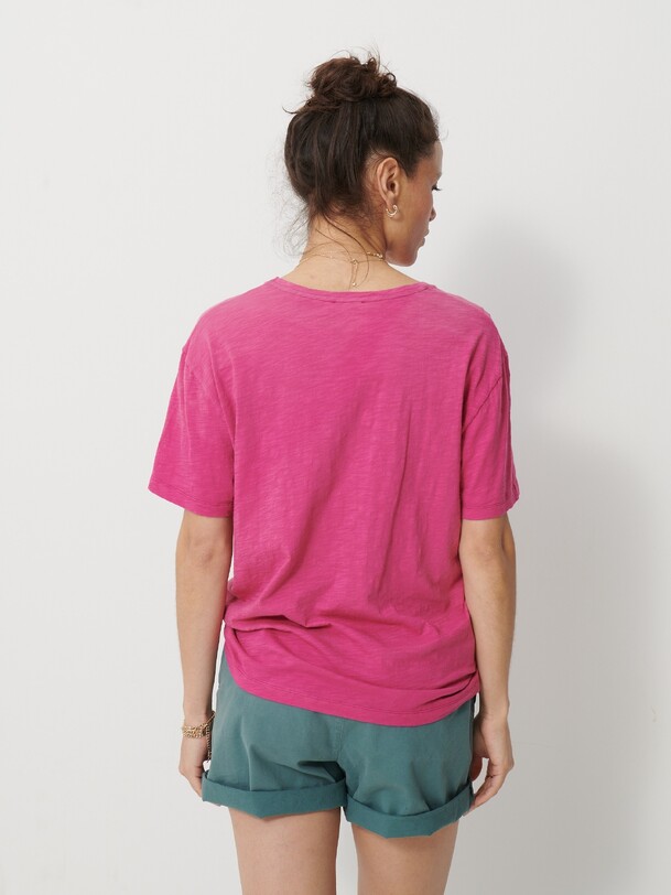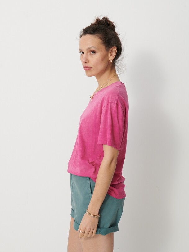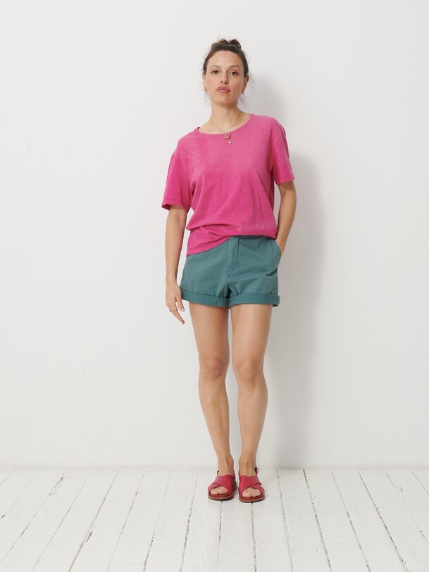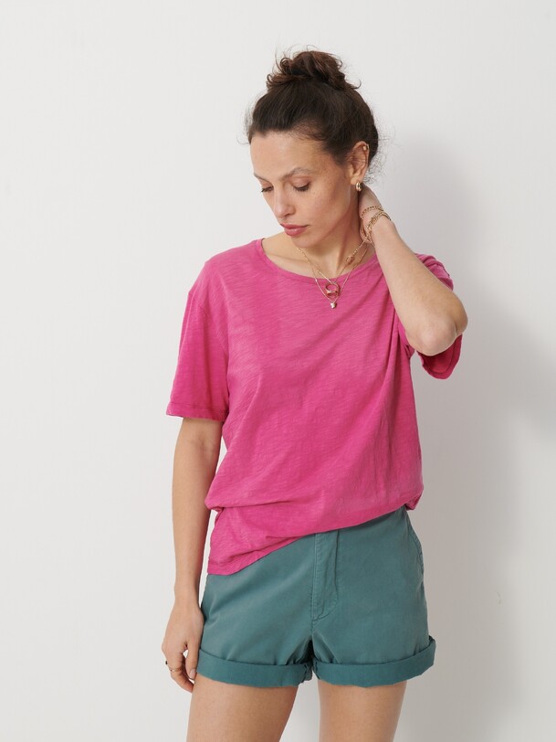 The July t-shirt is made from slub cotton with short sleeves. It features a boxy cut and a round neckline with neat topstitching. The hem is topstitched at the bottom and at the sleeve ends. The very edge of the neckline is finished in a contrasting colour.