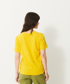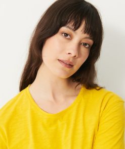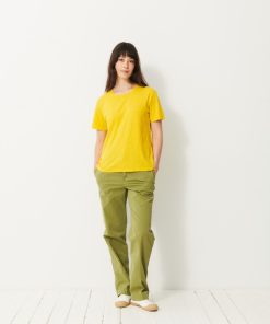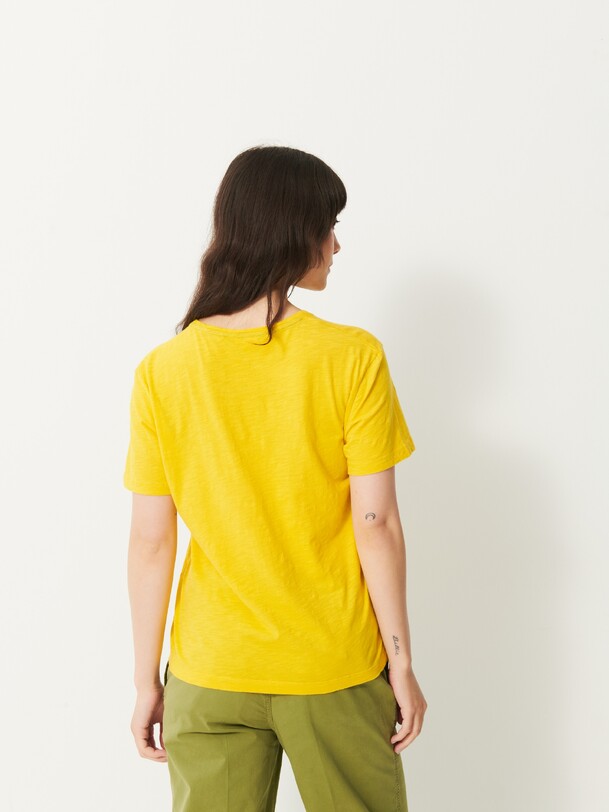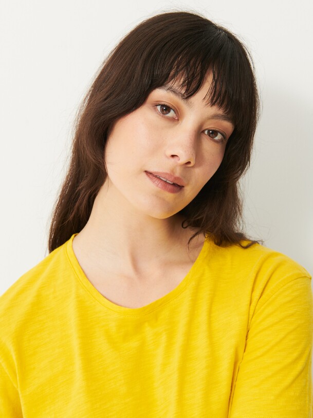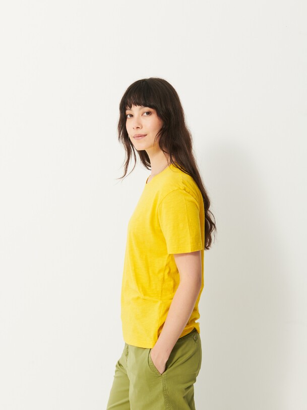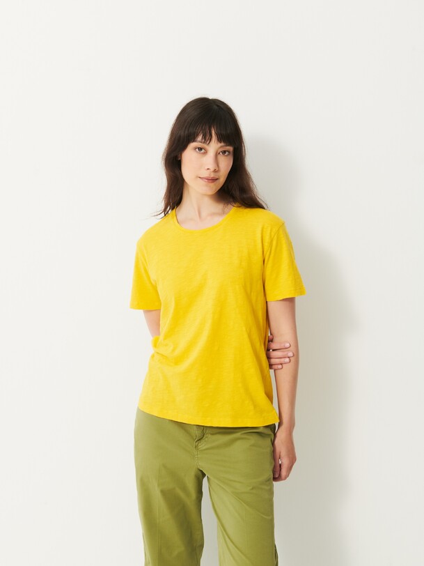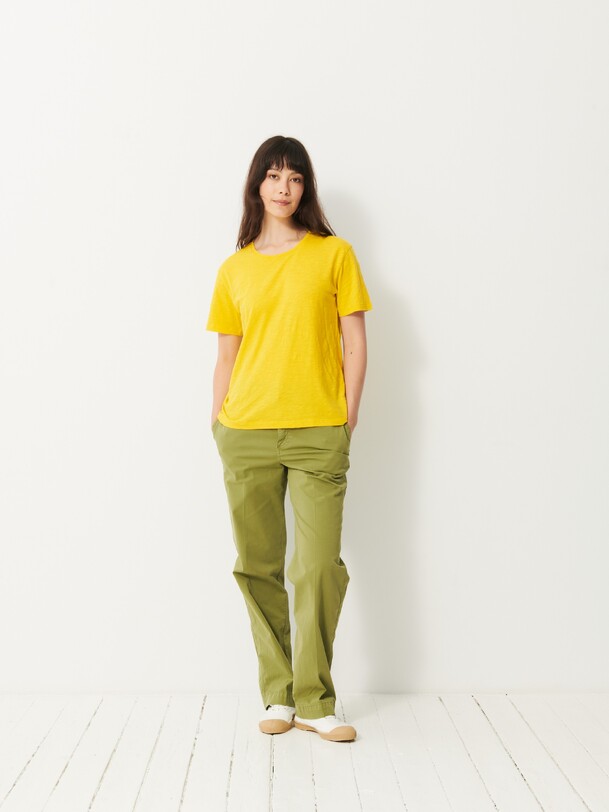 The July t-shirt is made from slub cotton with short sleeves. It features a boxy cut and a round neckline with neat topstitching. The hem is topstitched at the bottom and at the sleeve ends. The very edge of the neckline is finished in a contrasting colour.
