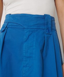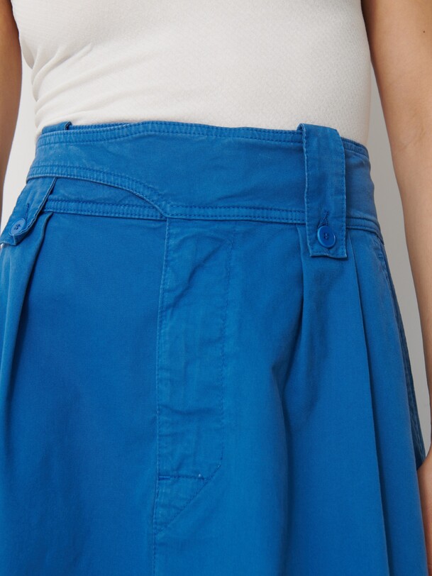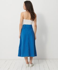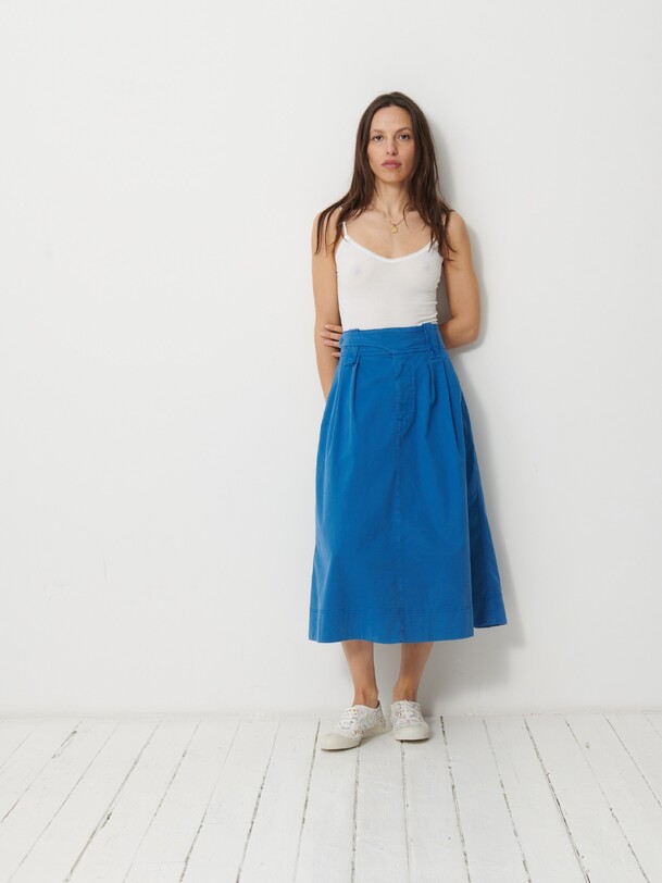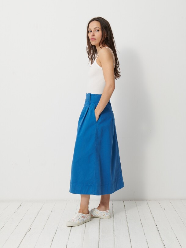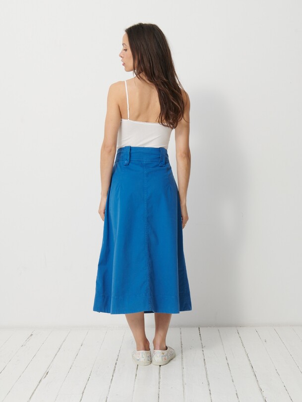 The Klea skirt is a flared gabardine skirt featuring a fly front and side slash pockets. It has an adjustable buttoned waistband with buttoned belt loops. Pleats are added to the front with darts at the back. Its hem is topstitched at the bottom.