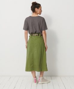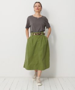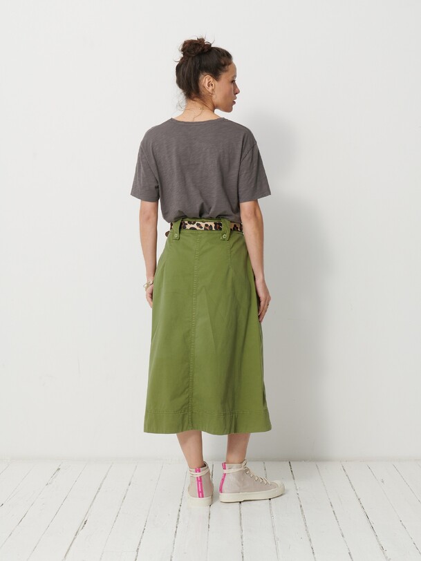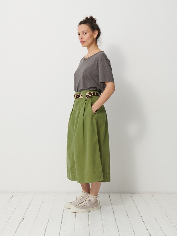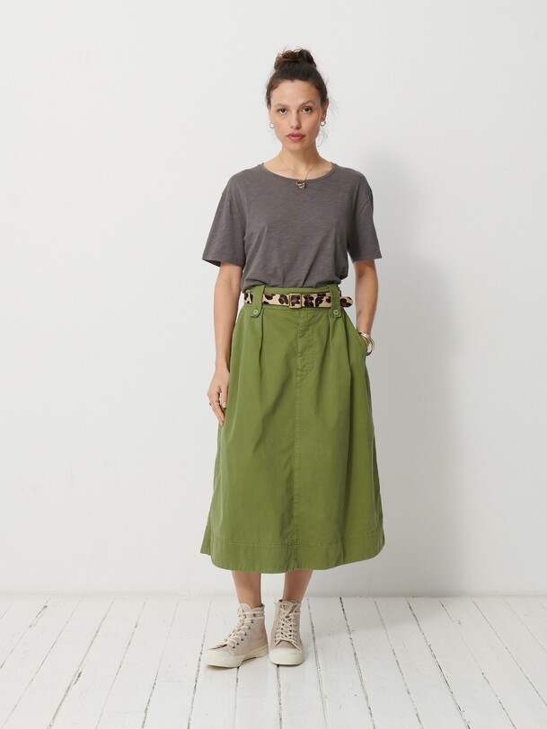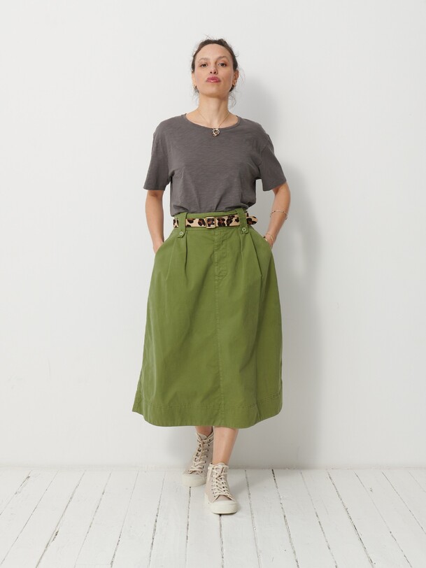 The Klea skirt is a flared gabardine skirt featuring a fly front and side slash pockets. It has an adjustable buttoned waistband with buttoned belt loops. Pleats are added to the front with darts at the back. Its hem is topstitched at the bottom.