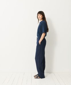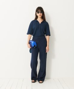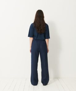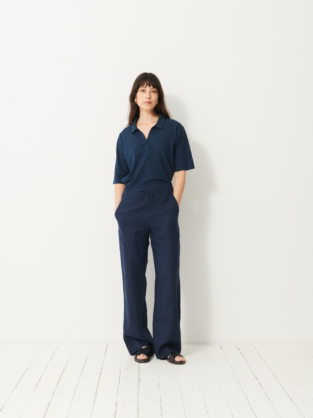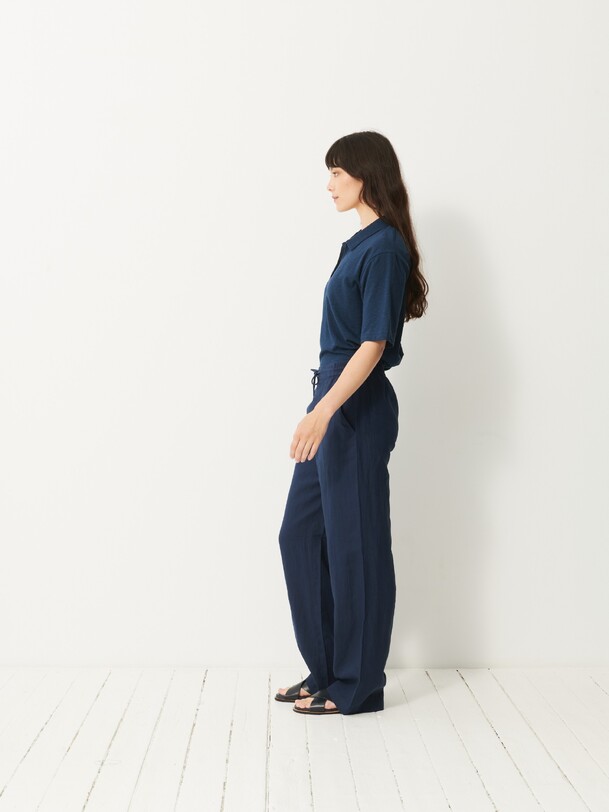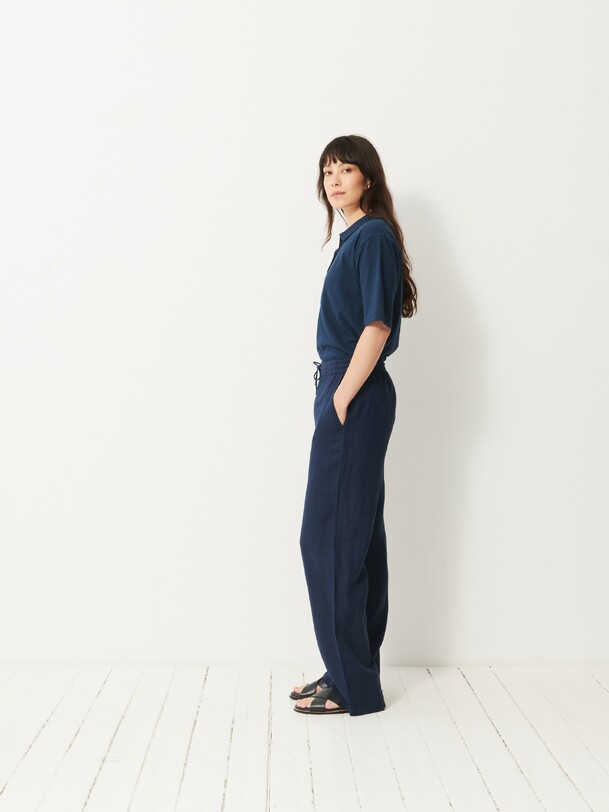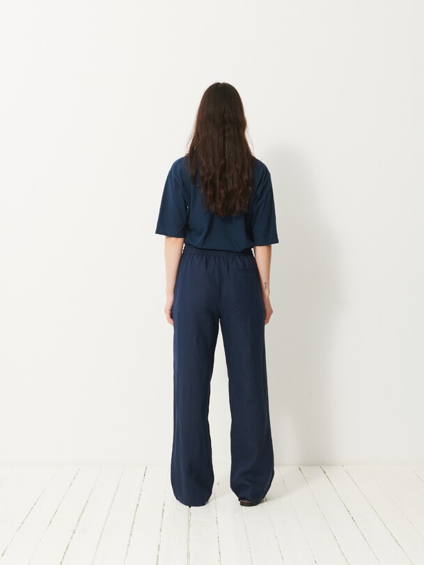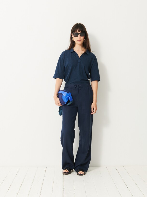 The Kybele trousers are long and straight. They feature an elasticated waistband at the back and a drawstring in matching cotton.