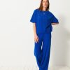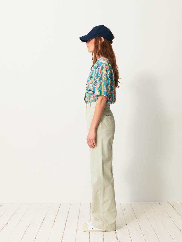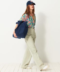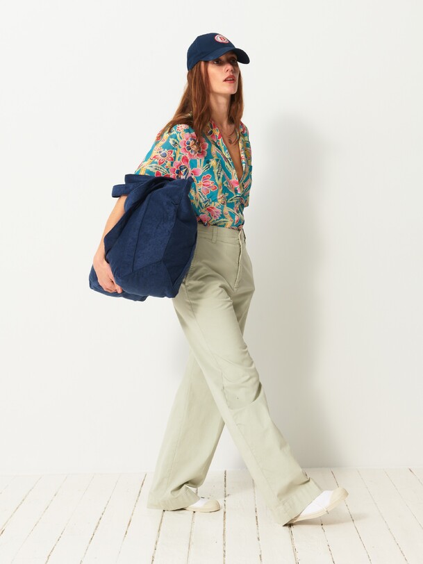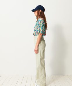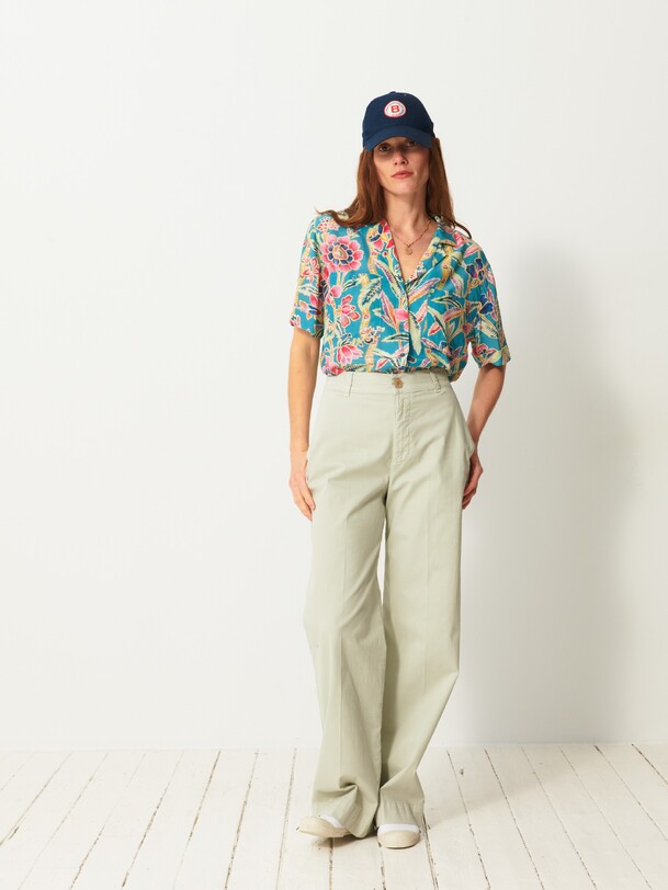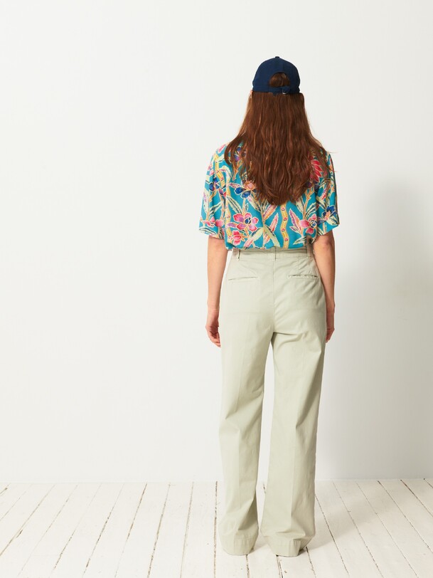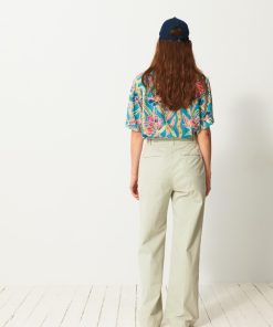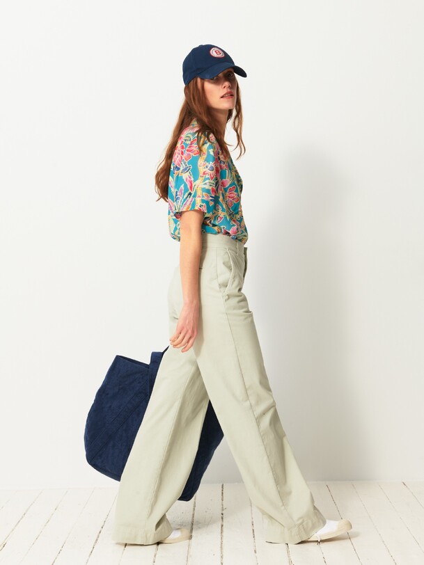 The Dama trousers are wide-leg in gabardine. They feature a high waist with a straight belt. The front pockets are Italian style, while the back pockets are welted. Its design is inspired by the 70s, with a long and sleek silhouette.