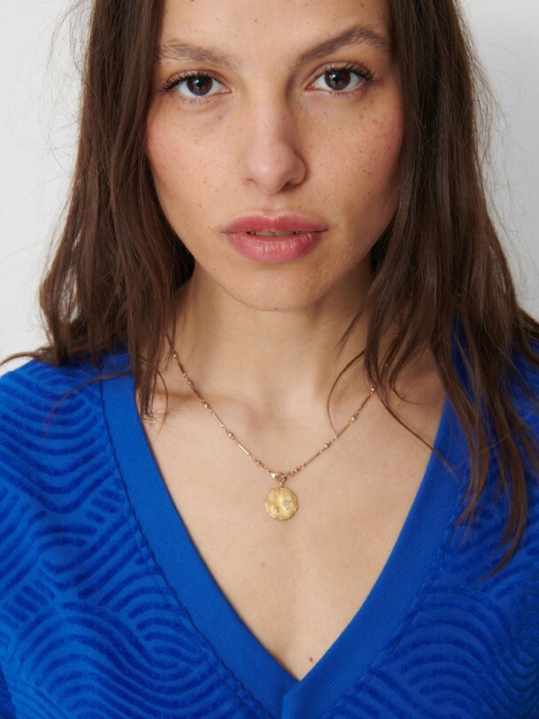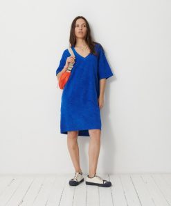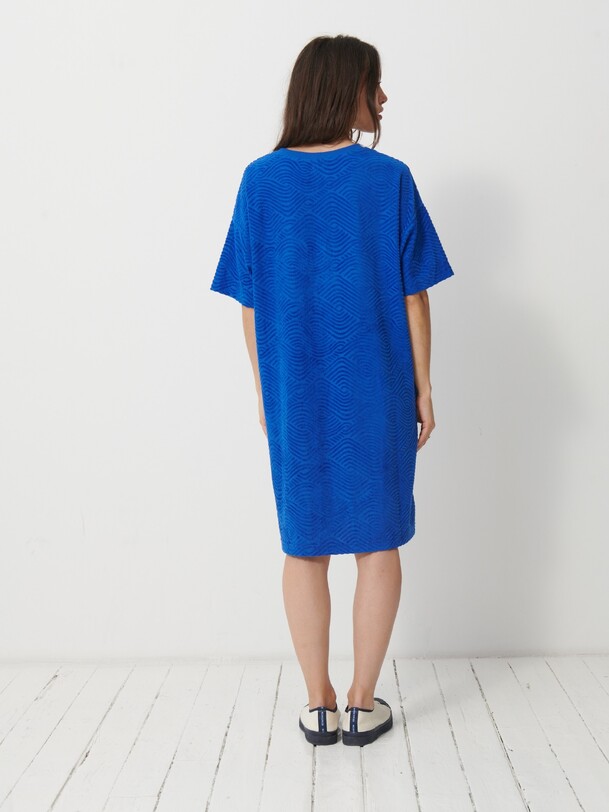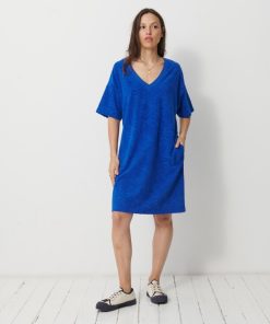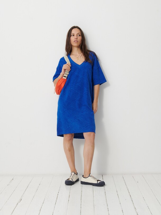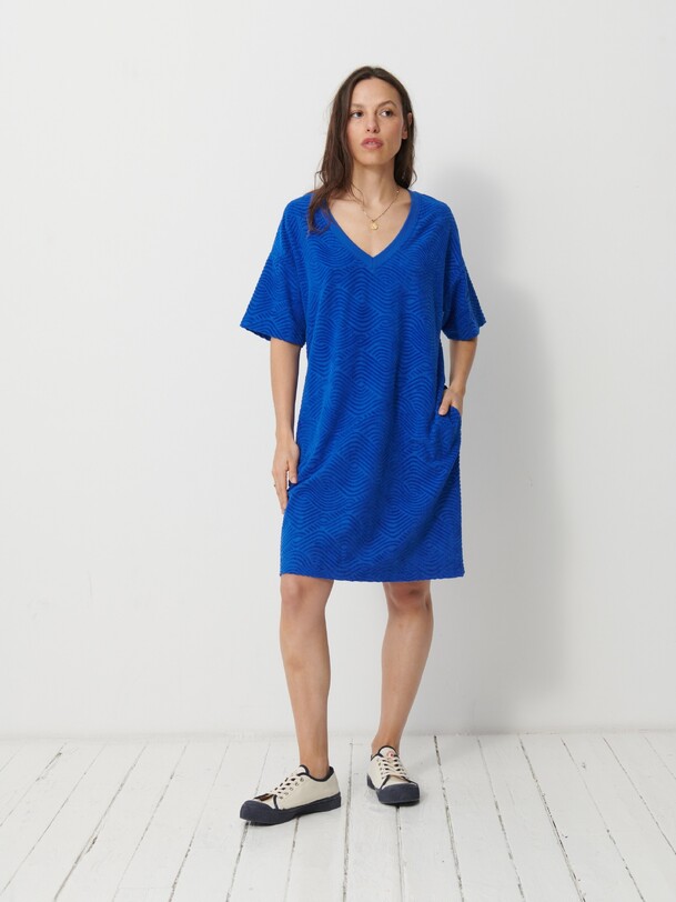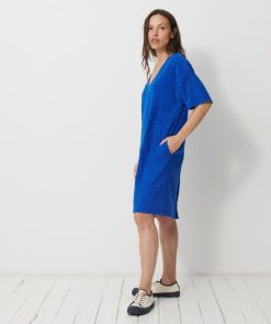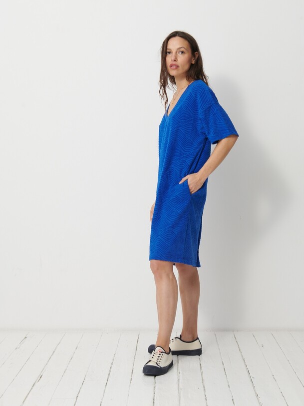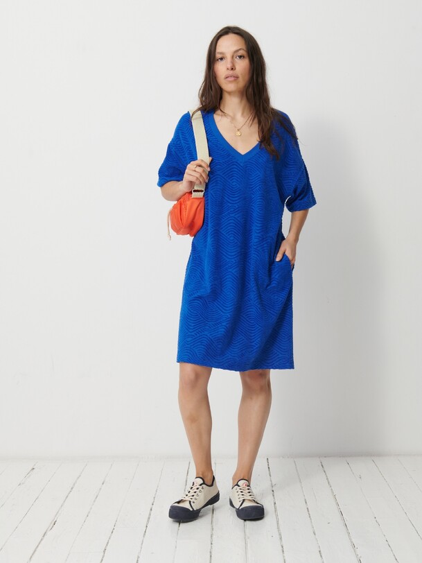 Loanelle Terry Dress with a whimsical touch. V-neck with ribbed trim. Short sleeves. Piped pockets featuring visible topstitching at the pocket base.