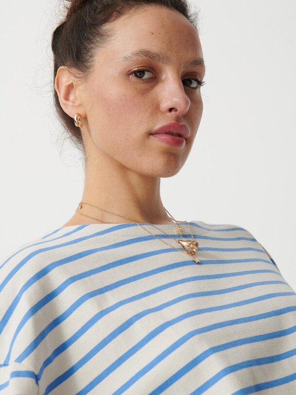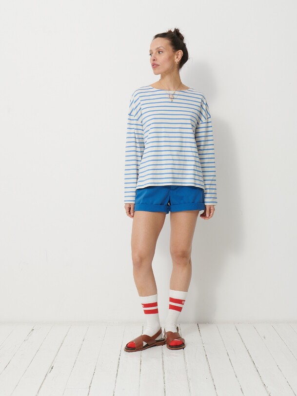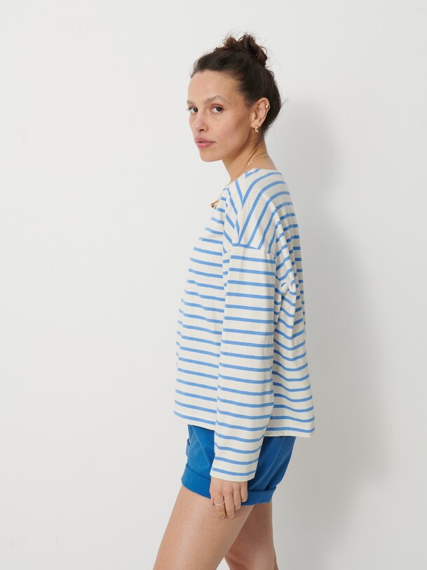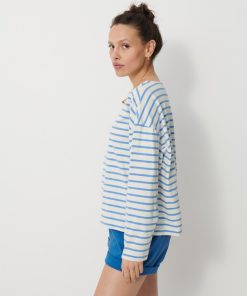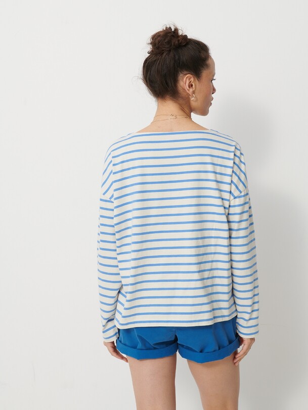 The Loick T-shirt draws inspiration from the classic marinière. It features a loose, straight fit for optimal comfort. The long sleeves come with wide armholes, lending a casual look. The interior finish is in a contrasting colour, adding a unique touch.