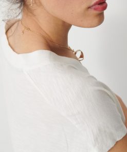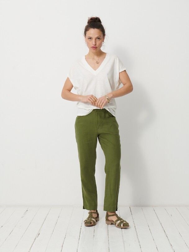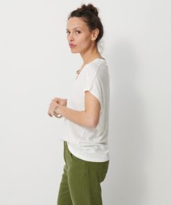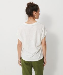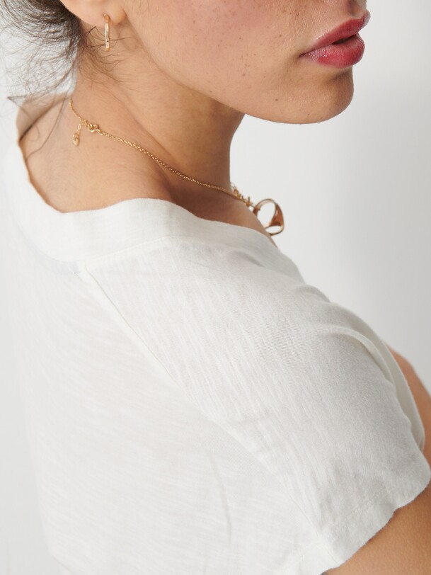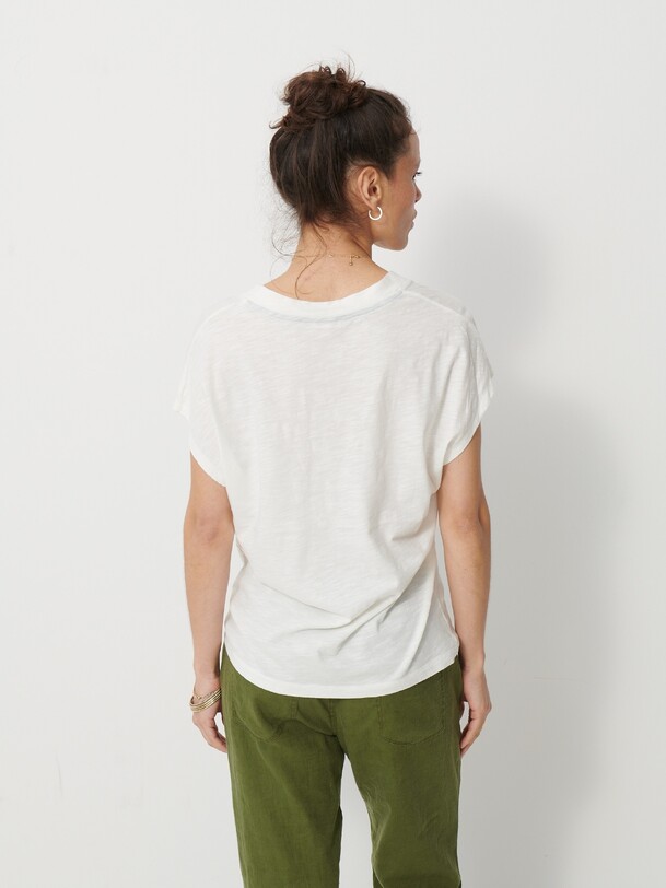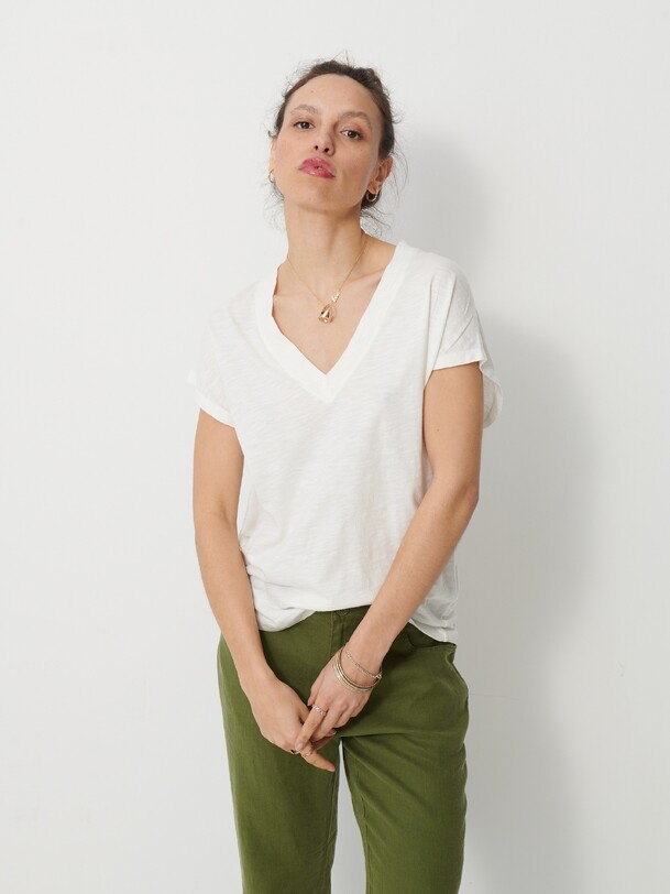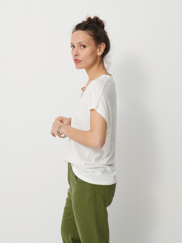 The Lucia T-shirt is a sleeveless staple in permanent jersey fabric, featuring a V-neckline with a ribbed trim.