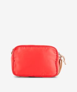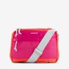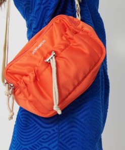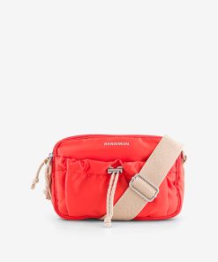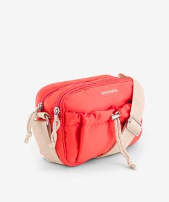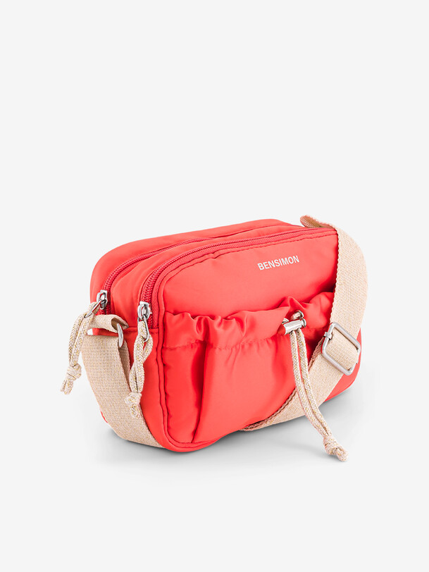 Small Madras bag with a compact capacity. It features two zippered storage pockets, a front pocket with drawstrings, and an interior zippered pocket. The handle is adjustable for a comfortable carry. Its zipper closure secures the bag. Dimensions: 20 cm long, 5.5 cm wide, and 14 cm high.