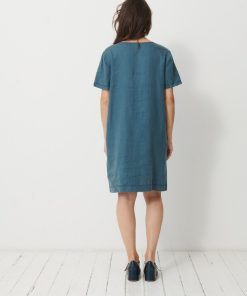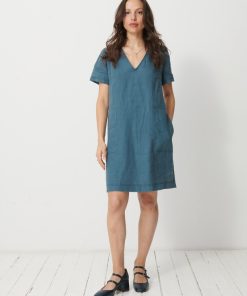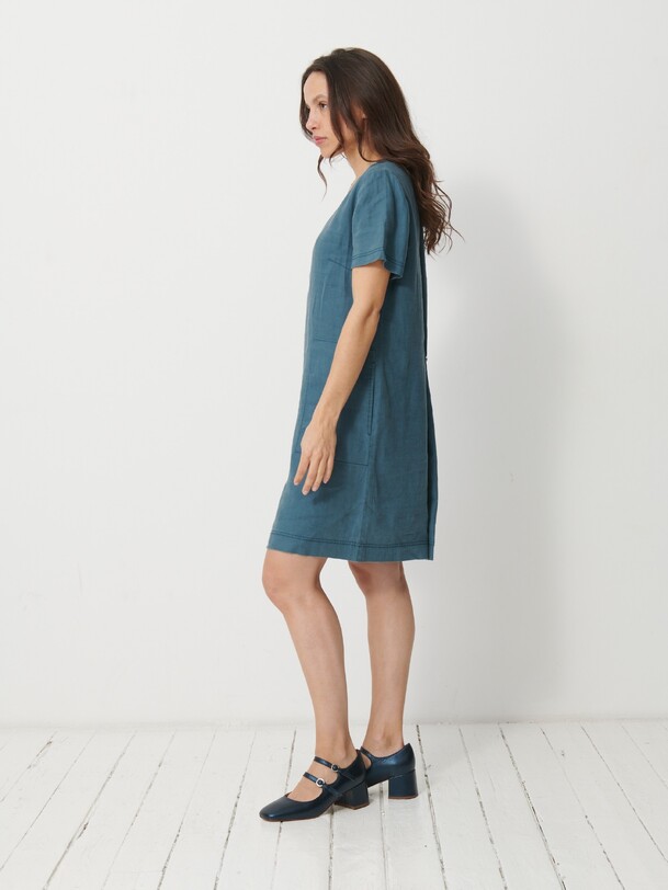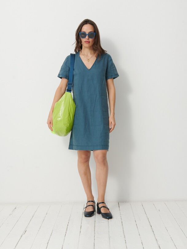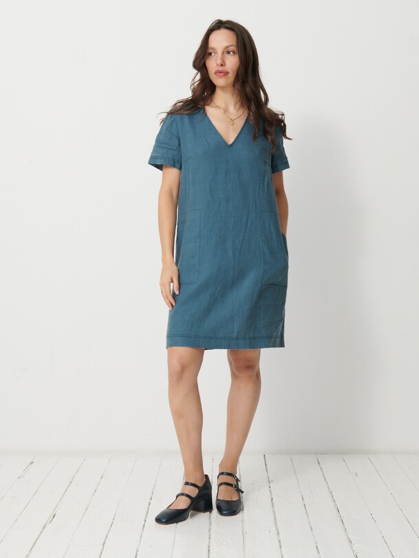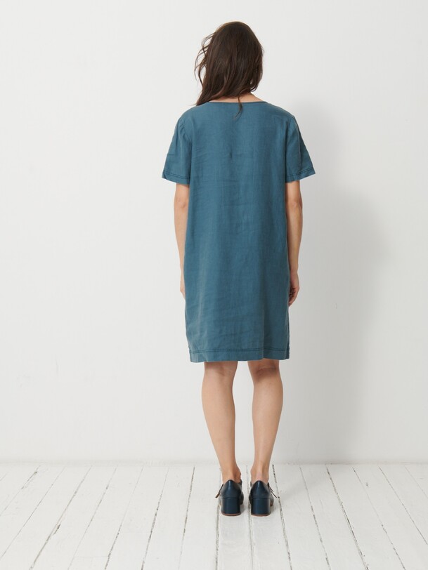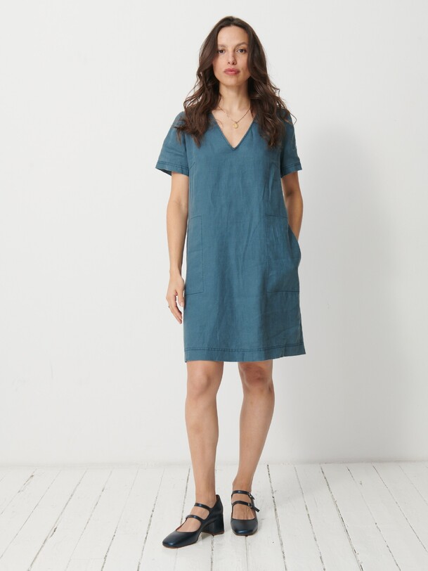 The Martine dress is a short linen dress. It features a straight cut and a V-neck. Equipped with bust darts and short sleeves, it also includes side welt pockets with a stitched pocket lining.
