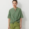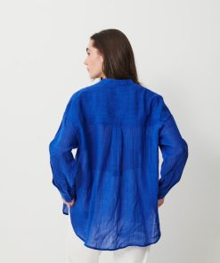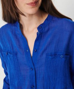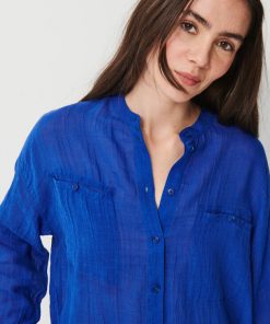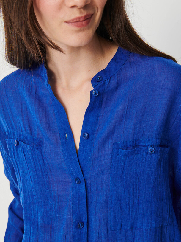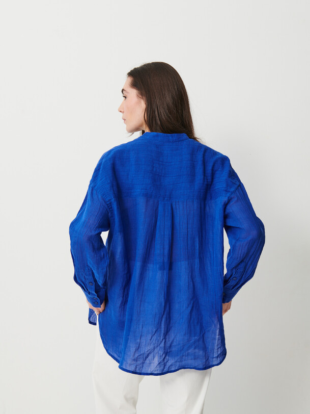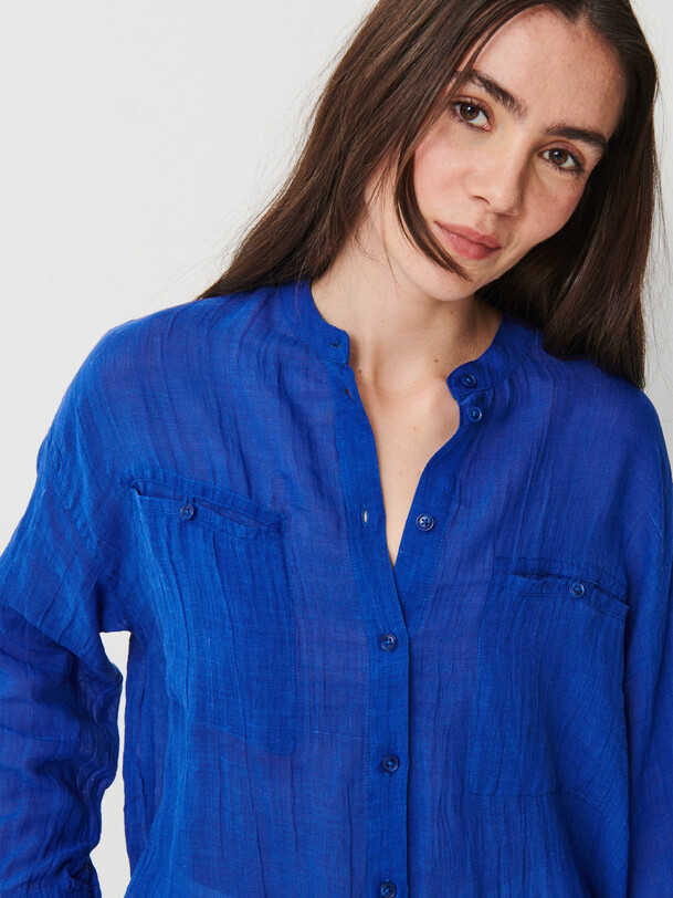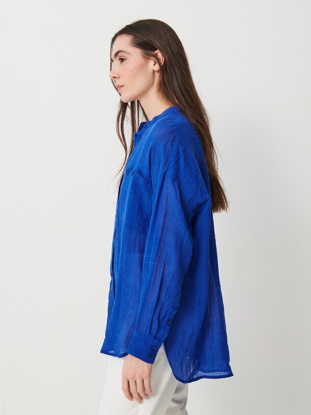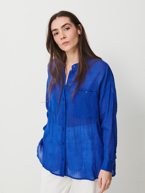 The Nicolle shirt features a masculine cut, distinguished by its fluid fabric that feminizes the silhouette. It features a stand collar and a shirt-tail hem with a longer back than front, and side slits. The two chest patch pockets are piped with visible topstitching at the bottom of the pocket and are closed with a shank button.