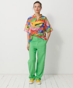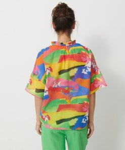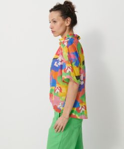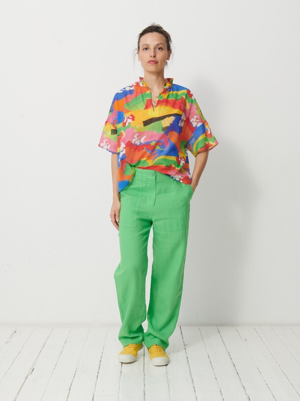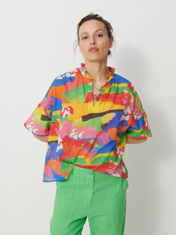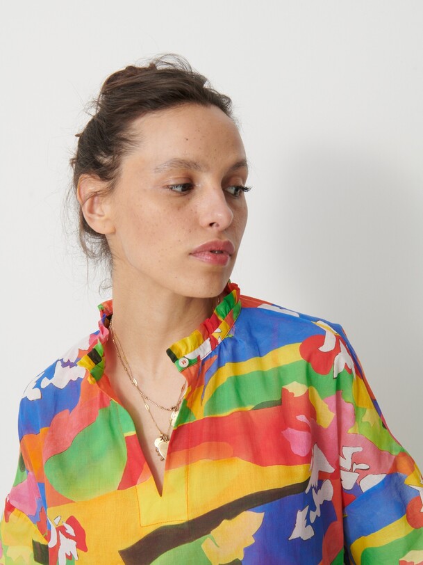 Nina blouse with short sleeves. Loose, straight fit. Collar embellished with small ruffles and a split round neckline. Gathering at the neckline and visible dart stitching.