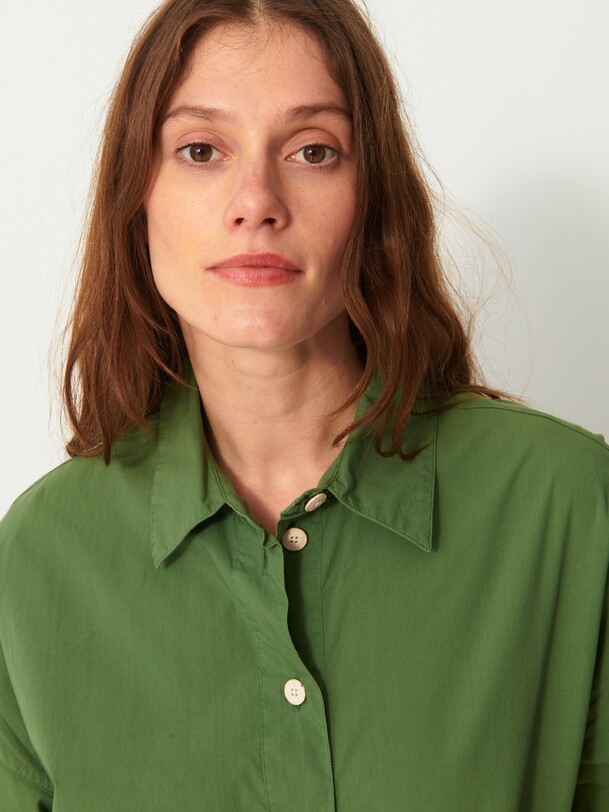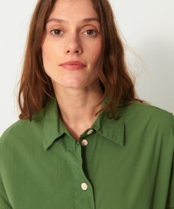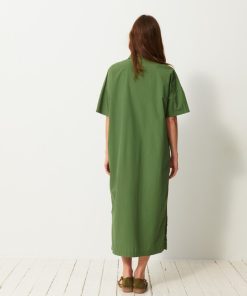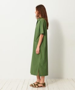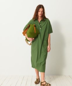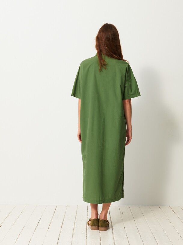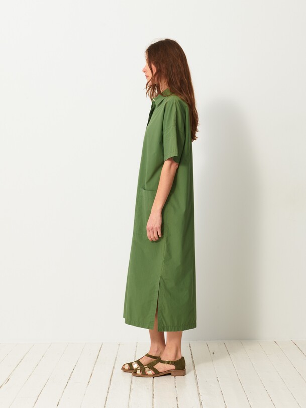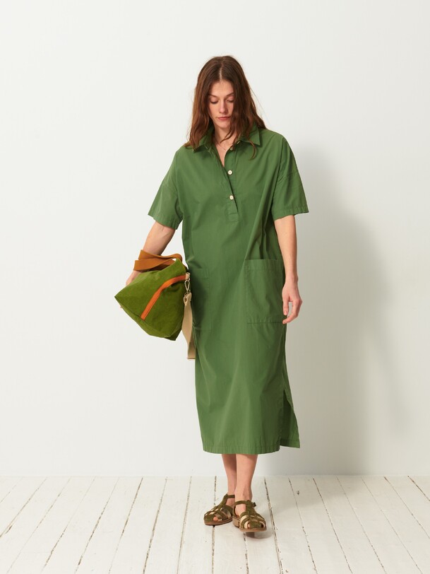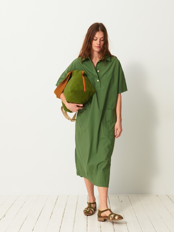 The Nora dress features short sleeves and a straight cut, falling to mid-calf length. It’s designed with a polo-style collar. Patch pockets with topstitching add detail, while side slits introduce a touch of modernity.