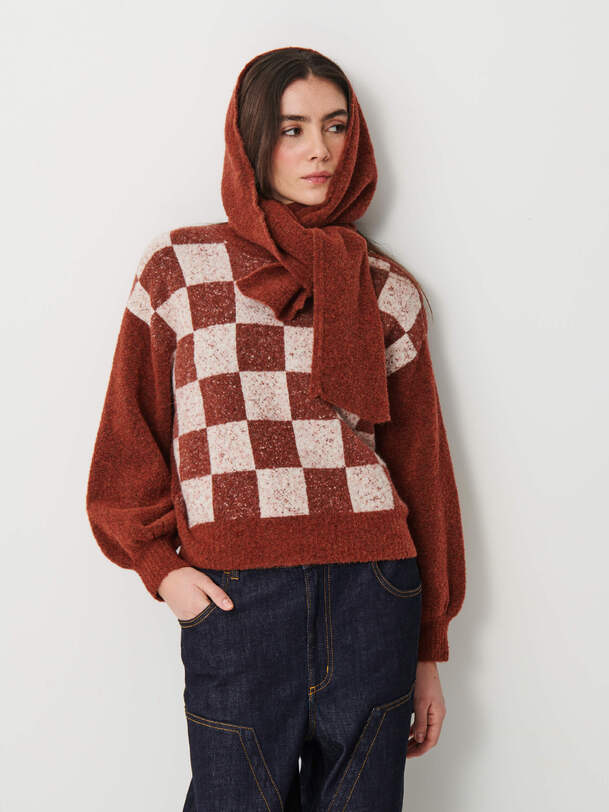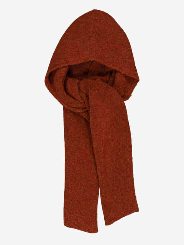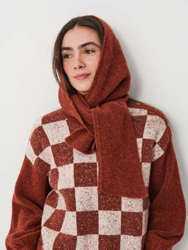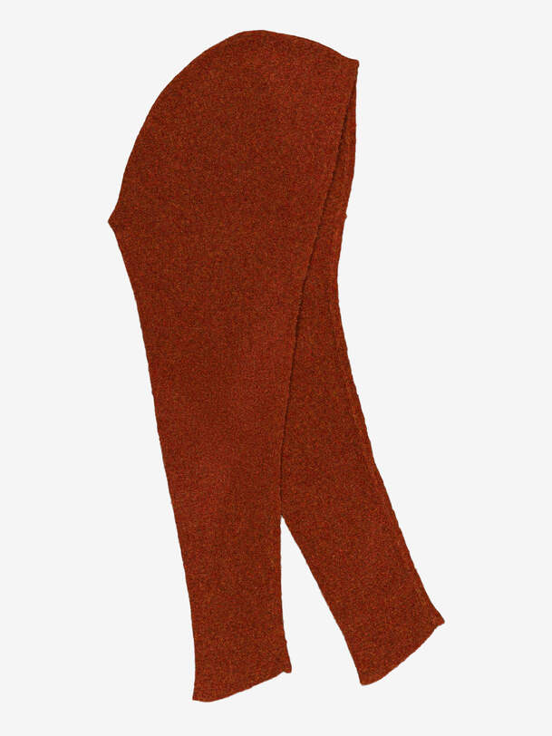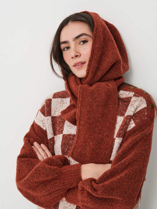 Conceived as a hood and designed to be worn under a sweater or a coat, the Ophelia scarf unfolds, wraps and ties around the neck in a single gesture. Made mostly from wool and alpaca, its soft, slightly downy knit provides warmth and comfort without excess bulk. A nomadic accessory—both protective and elegant—that finishes an outfit with a touch of character.