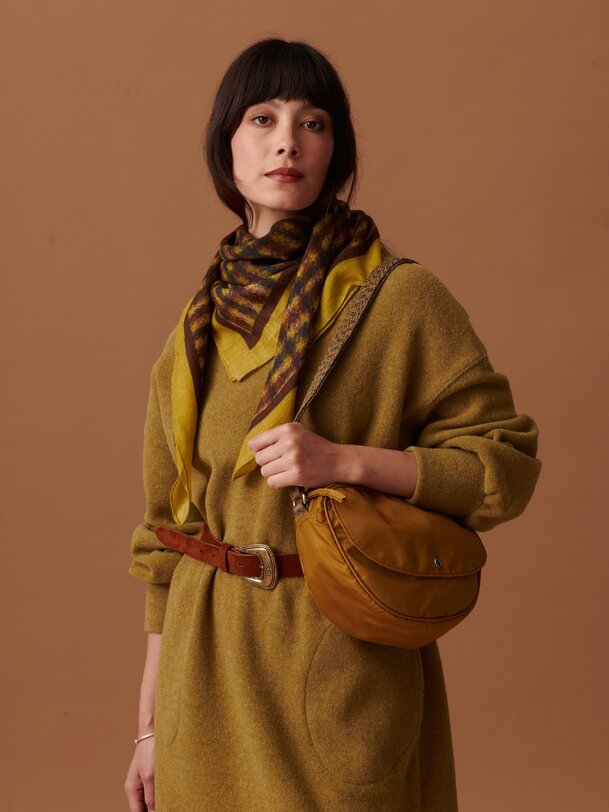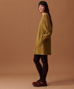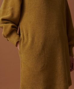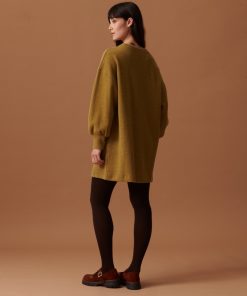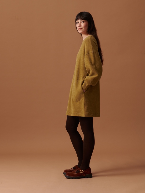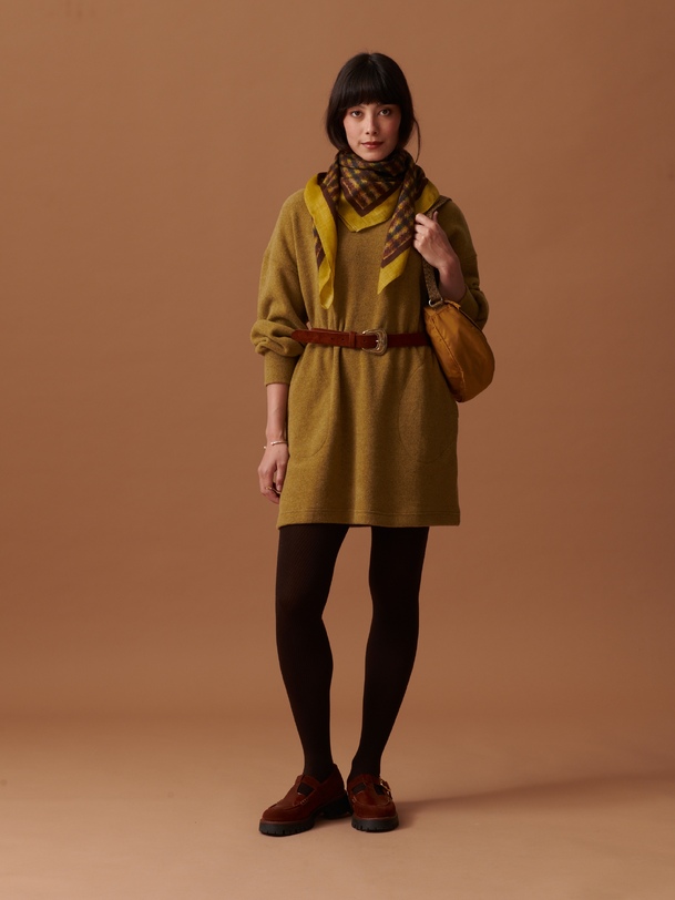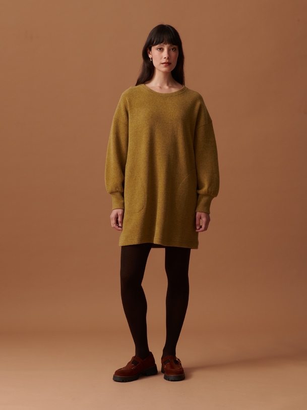 The Orelia dress is all about structured comfort: made from double-sided knit fabric, it features long, voluminous sleeves with fitted cuffs, a simple round neckline and patch pockets on the front. Its mid-thigh length makes it easy to wear on its own or with tights and boots. Made primarily from cotton and wool, it provides warmth and softness without being heavy — a versatile piece for cooler days.