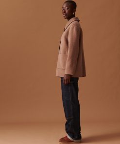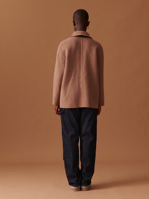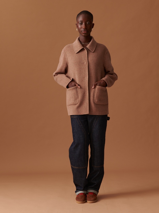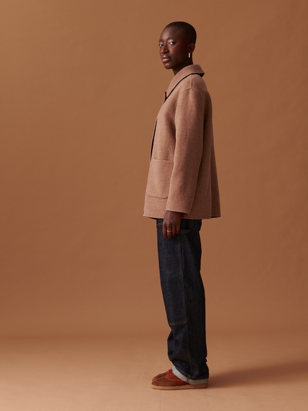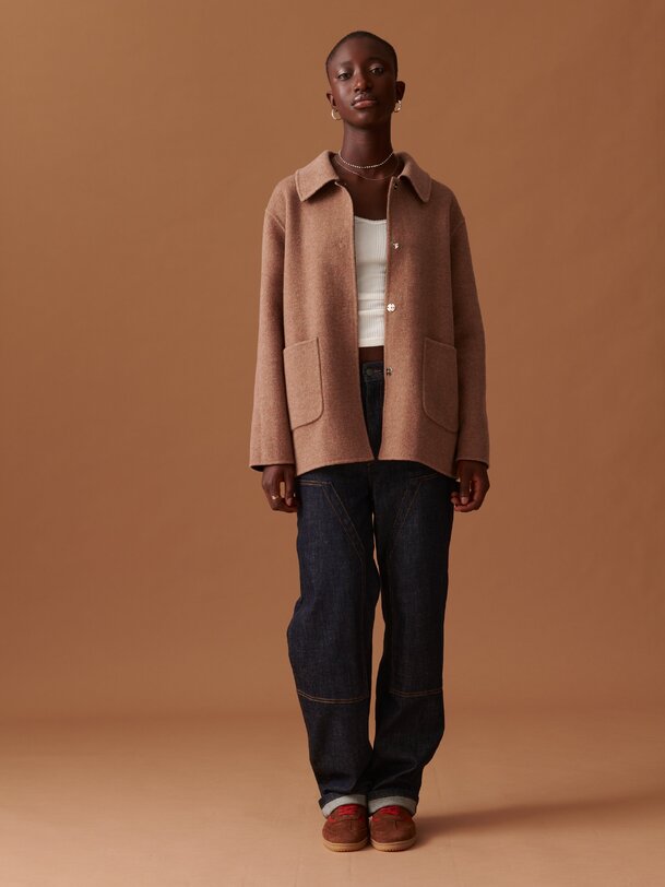 Camel Orielle jacket, reversible, with patch pockets. Double-sided and straight cut: a jacket designed to last.