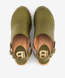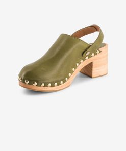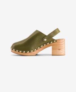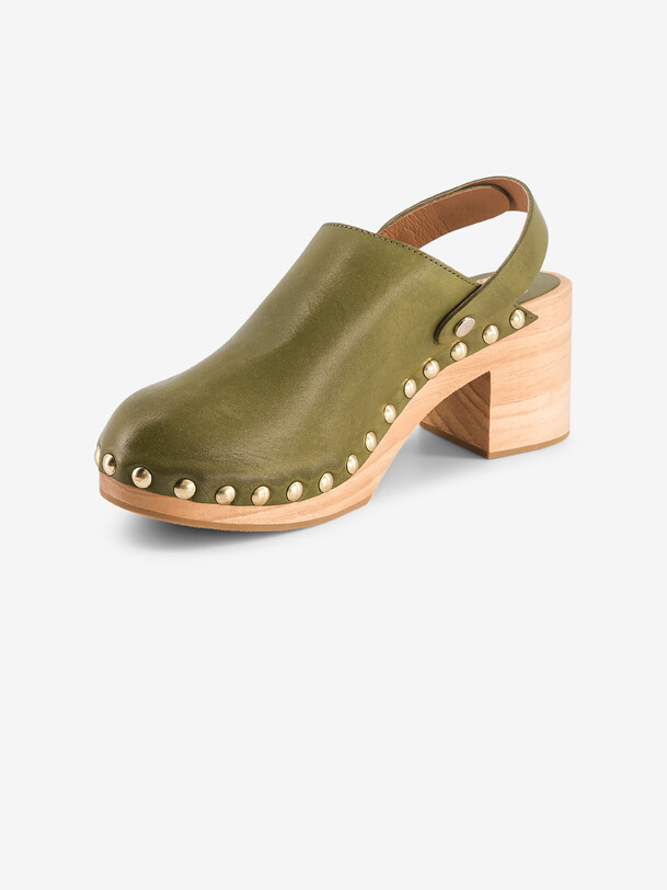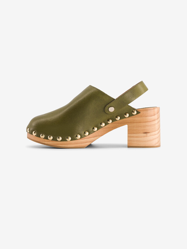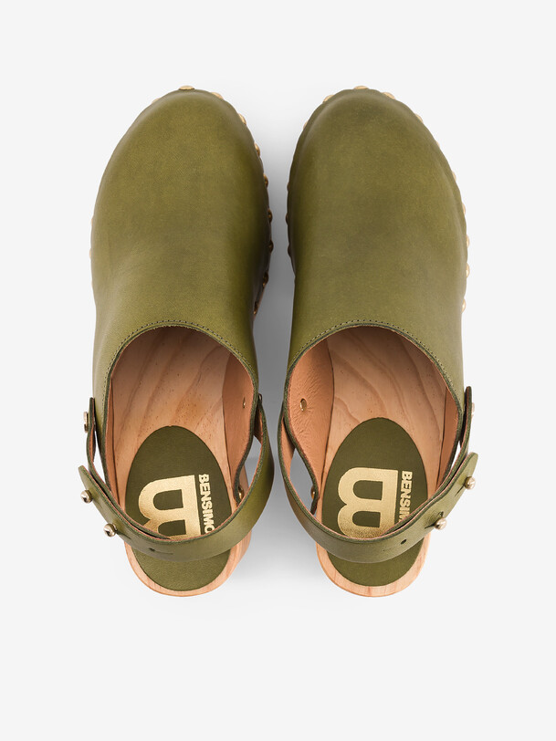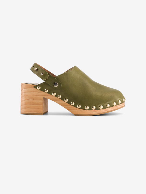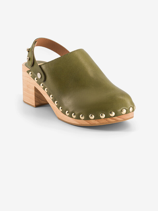 The Bensimon khaki leather clogs boast a bold, textured aesthetic. The contrast between the matte leather and the light wood base is enhanced by the metal rivets that emphasize the silhouette. The slingback strap provides good support, while the block heel adds just the right amount of height. Pair with white pants, a denim skirt, or a flowing jumpsuit. A pair with a strong character, somewhere between natural and modern, that stands out effortlessly.
