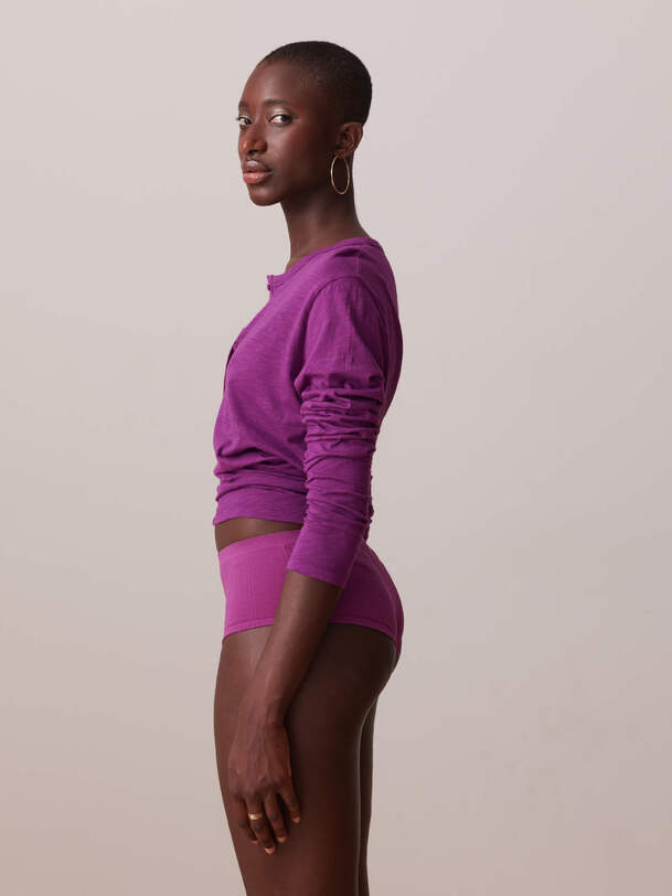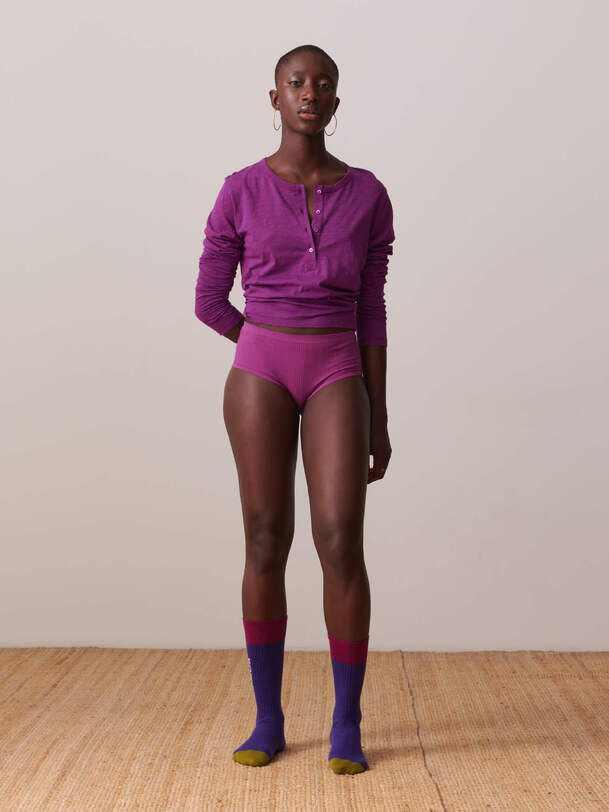Low-rise ribbed shorts. The ribbing is arranged diagonally for a graphic effect.