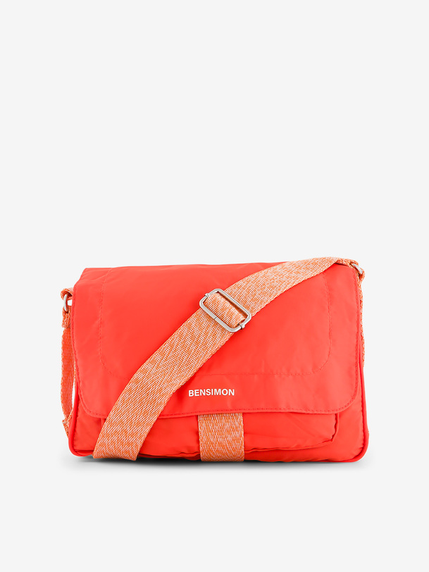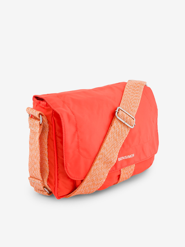 Satchel with flap and adjustable shoulder strap. It features three pockets: two without zippers and one with a zipper. It closes with a magnetic button. Dimensions: Length 29 cm, Width 7 cm, Height 20 cm. Zipped pocket inside.