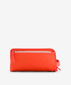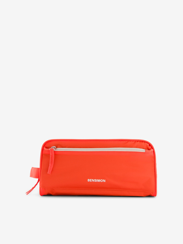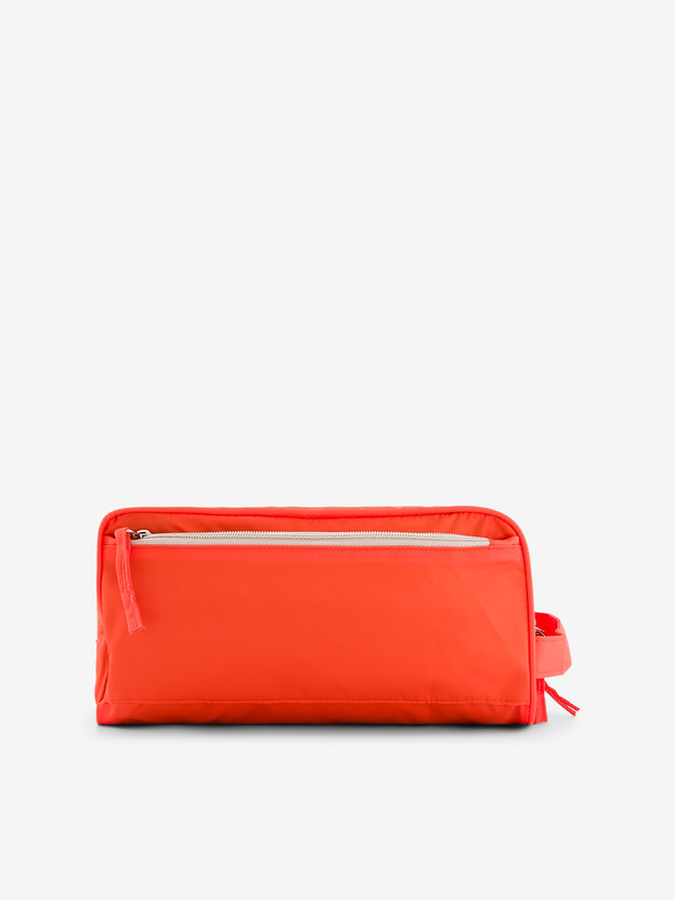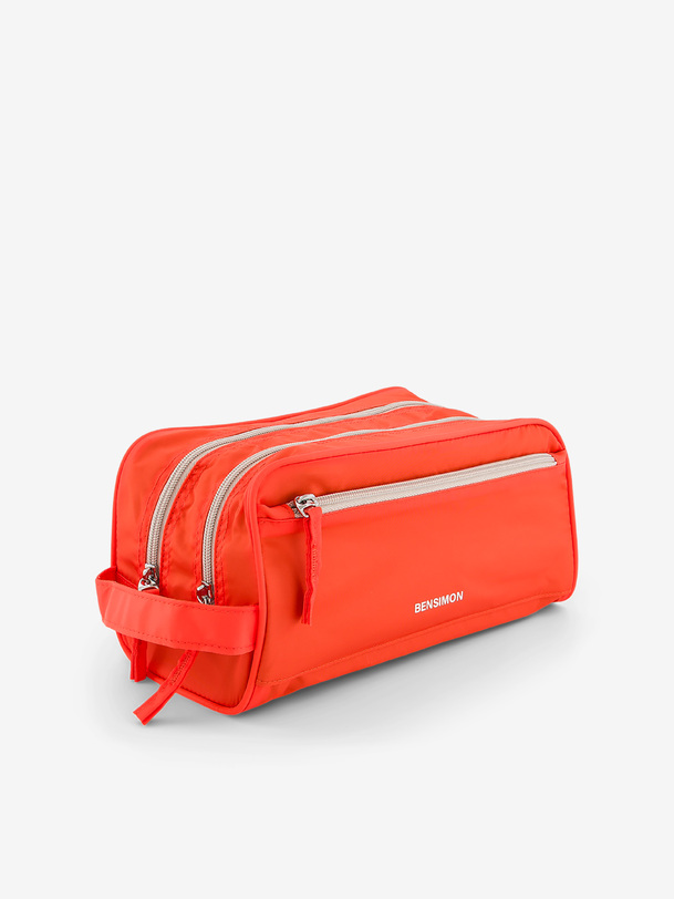 Toiletry bag with 2 large zippered pockets, and 2 zippered pockets on the front and back. It also includes 4 interior pockets. Dimensions: 27 cm long, 14 cm wide, and 12 cm high. Zipper closure.
