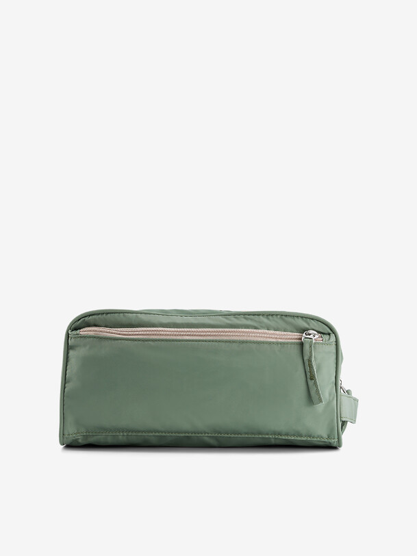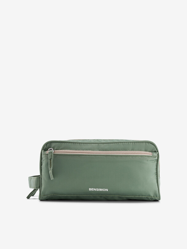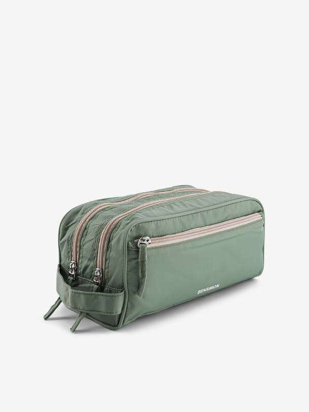 Description: Toiletry bag with 2 large zippered pockets and 2 zippered pockets on the front and back. It also includes 4 interior pockets. Dimensions: 27 cm long, 14 cm wide, and 12 cm high. Zipper closure.